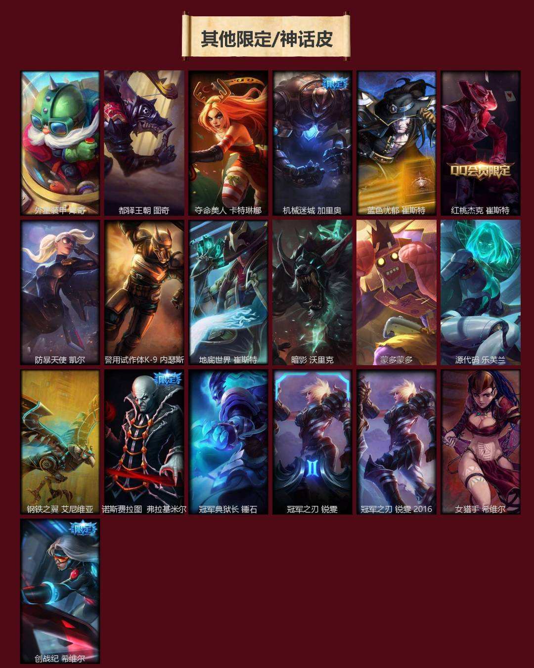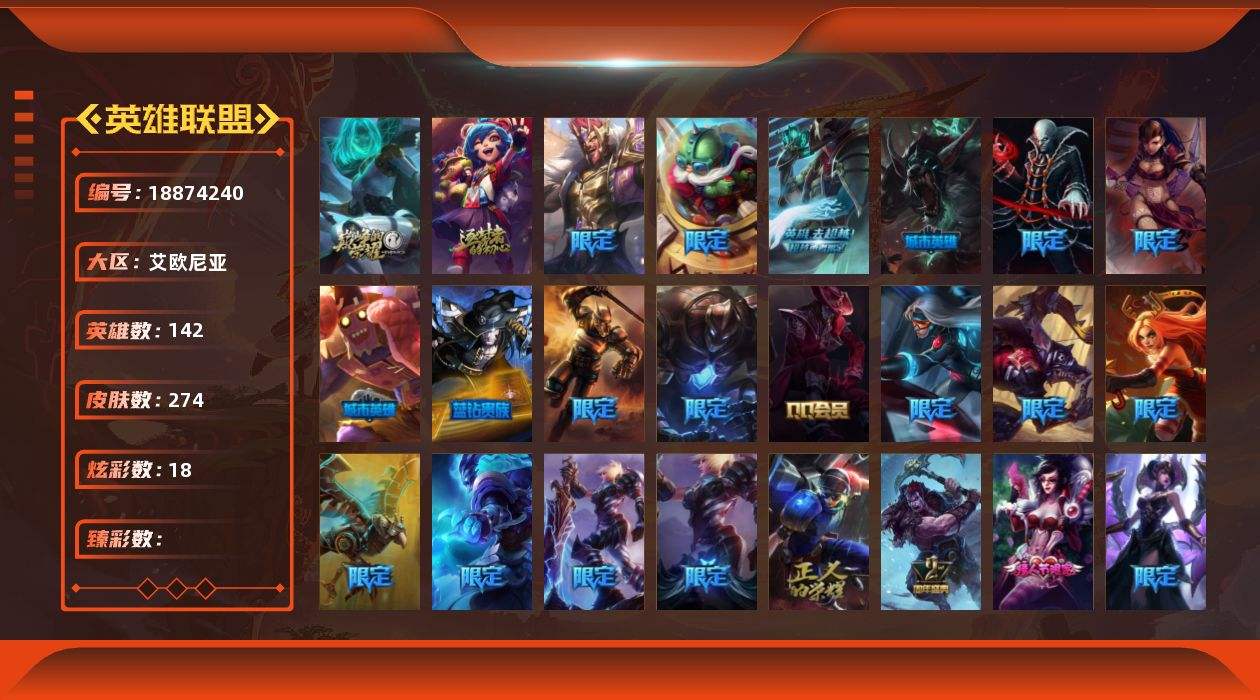 【695518】[18874240]2神话 53限定 13传说 69史诗 274皮肤 18炫彩 142英雄 可二次 可修改实名 游戏信用分低于350【情人节限定】觅心猎手 薇恩【赛季限定皮】胜利行刑官 德莱文,胜利巨口 克格莫,胜利之王 泰达米尔,胜利女神 莫甘娜,胜利女神 希维尔,胜利之树 茂凯,胜利枪神 格雷福斯,胜利女神 奥莉安娜,胜利之剑 亚托克斯,胜利枪神 卢锡安【冠军限定系列】S2