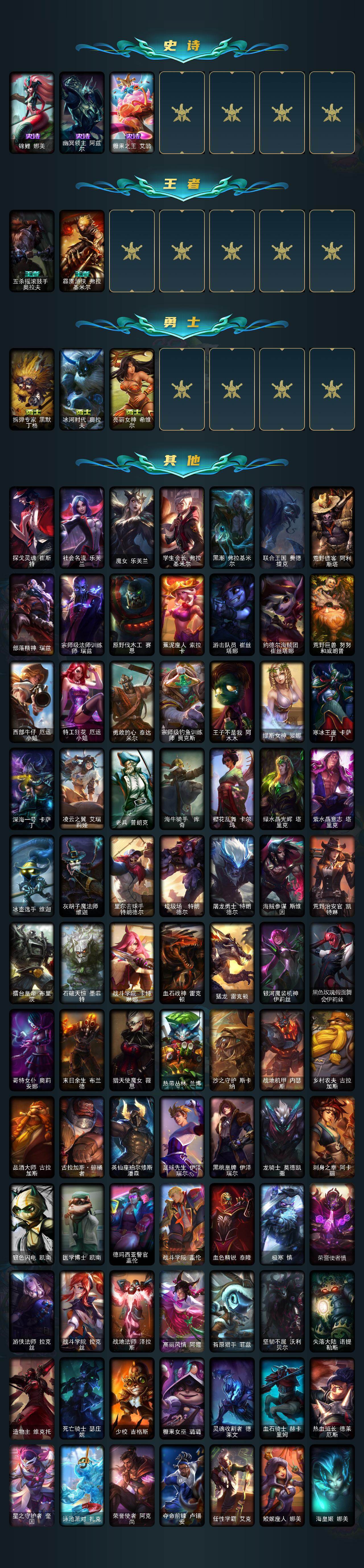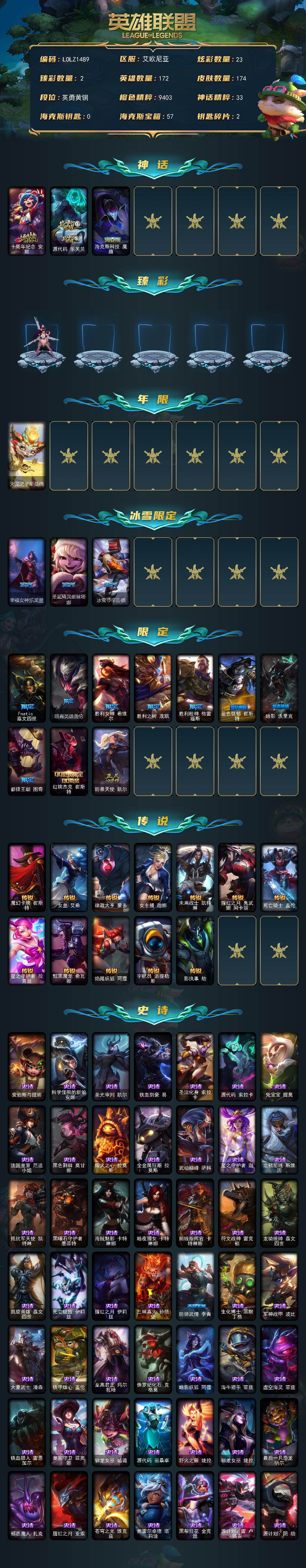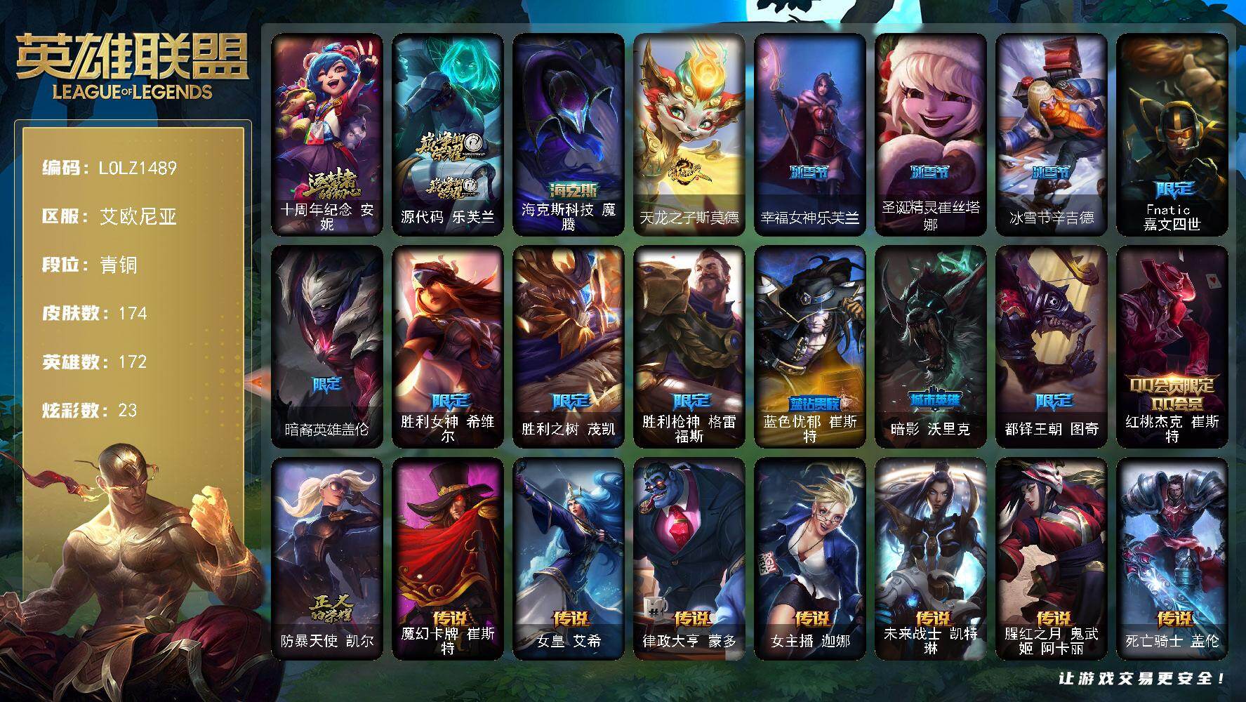 【695604】【LOLZ1489】172英雄/174皮肤/3神话/14限定/2臻彩/23炫彩/12传说/52史诗/青铜/十周年纪念安妮/源代码乐芙兰/海克斯科技魔腾/玉剑传说舞剑仙承影/战斗学院卡特琳娜盛典礼服/天龙之子斯莫德/幸福女神乐芙兰/圣诞精灵崔丝塔娜/冰雪节辛吉德/Fnatic嘉文四世/暗裔英雄盖伦/胜利女神希维尔/胜利之树茂凯/胜利枪神格雷福斯/蓝色忧郁崔斯特/暗影妖狐阿狸/都铎王