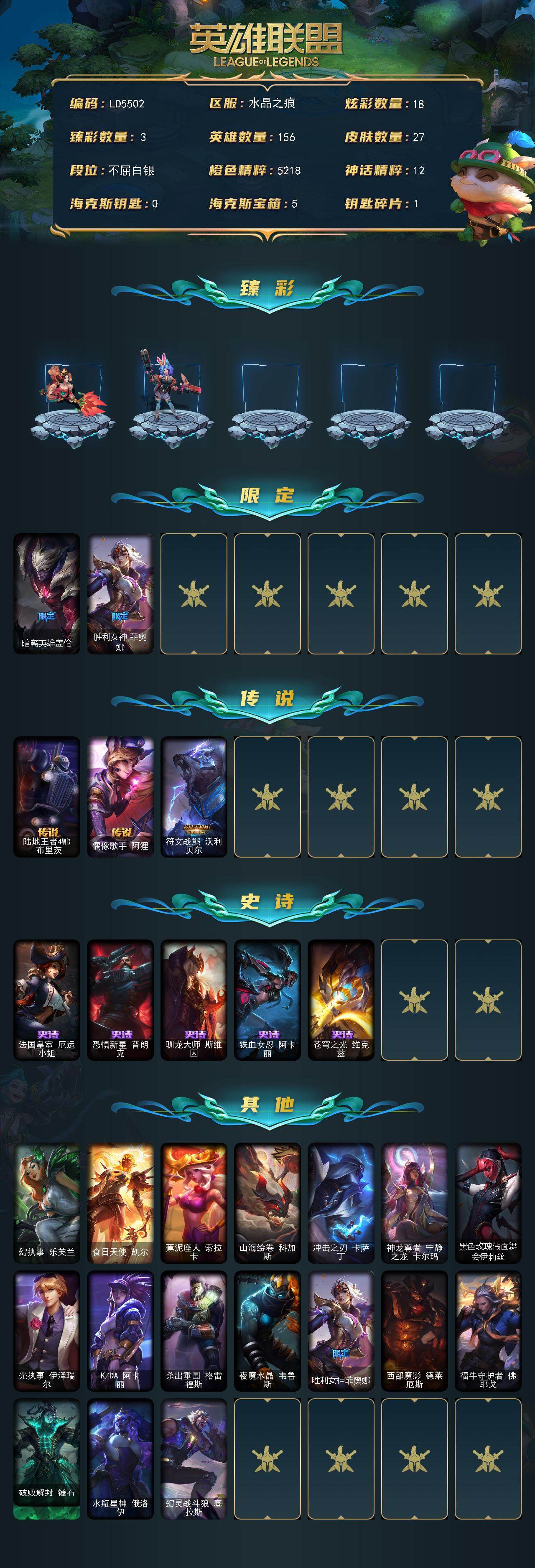 【696777】【LD5502】156英雄/27皮肤/3限定/3臻彩/18炫彩/3传说/5史诗/白银/幻灵战斗蝠薇恩梦幻强袭/玉剑传说寒潭夭夭胭脂/幻灵战斗队长厄运小姐勇气赞歌/暗裔英雄盖伦/胜利女神菲奥娜/陆地王者4WD布里茨/偶像歌手阿狸/符文战熊沃利贝尔/法国皇室厄运小姐/恐惧新星普朗克/驯龙大师斯维因/铁血女忍阿卡丽/苍穹之光维克兹/幻执事乐芙兰/食日天使凯尔/蕉泥座人索拉卡/山海绘卷科