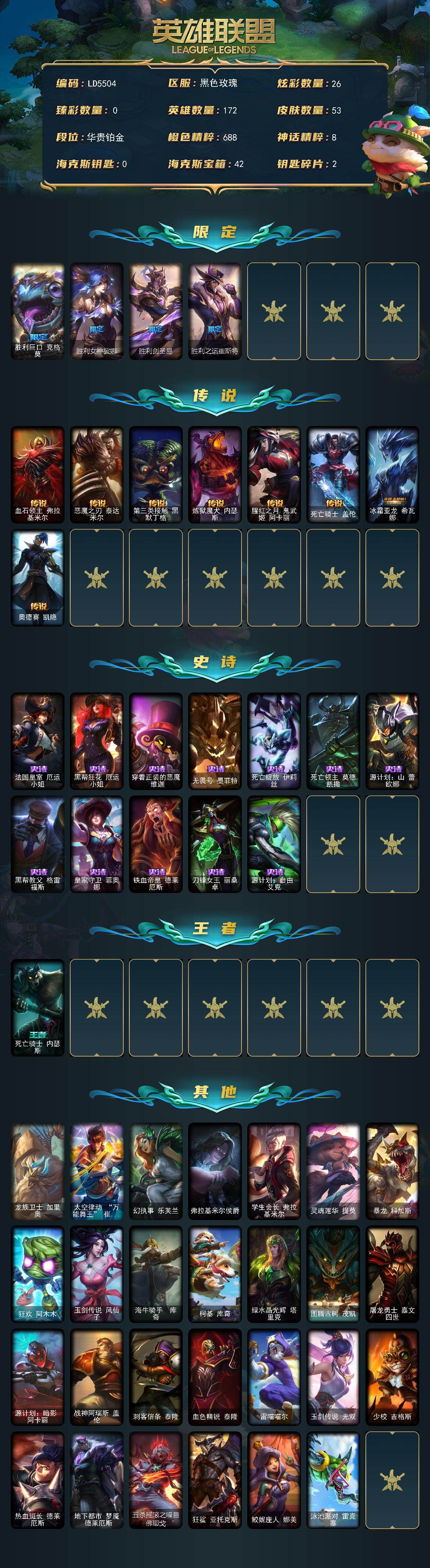 【696845】【LD5504】172英雄/53皮肤/5限定/26炫彩/8传说/12史诗/铂金账号等级:229/胜利巨口克格莫/胜利女神娑娜/胜利剑圣易/胜利之运崔斯特/血石领主弗拉基米尔/恶魔之刃泰达米尔/第三类接触黑默丁格/炼狱魔犬内瑟斯/腥红之月鬼舞姬阿卡丽/死亡骑士盖伦/冰霜亚龙希瓦娜/奥德赛凯隐/法国皇室厄运小姐/黑帮狂花厄运小姐/穿着症状的恶魔维嘉/无畏号墨菲特/死亡绽放伊莉丝/死亡