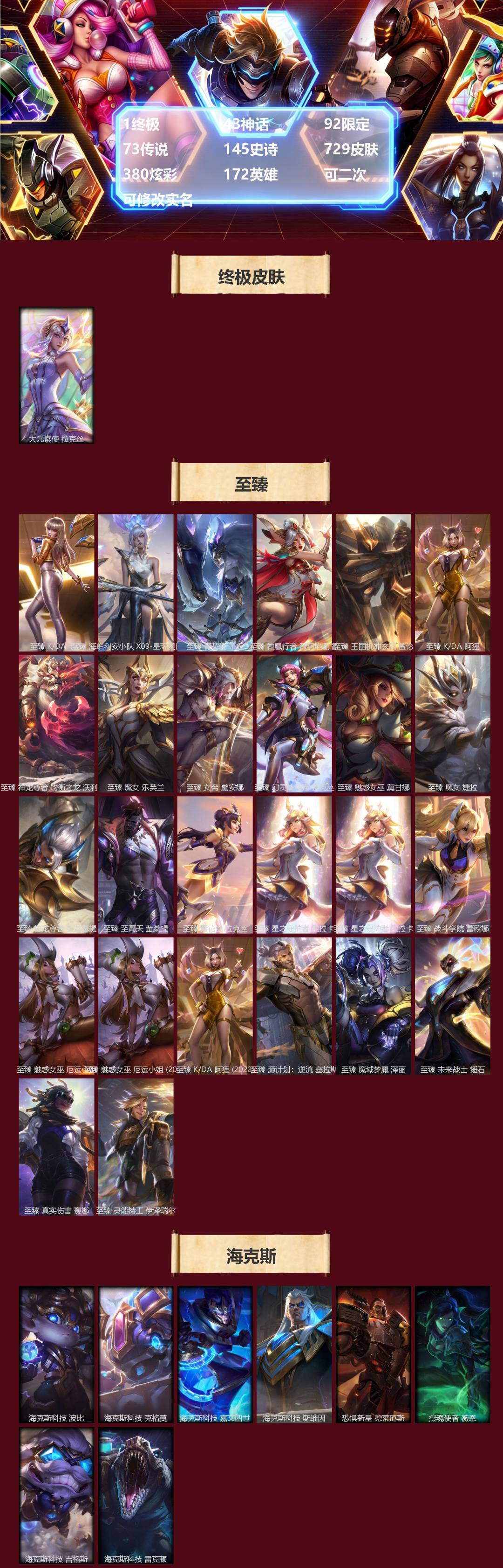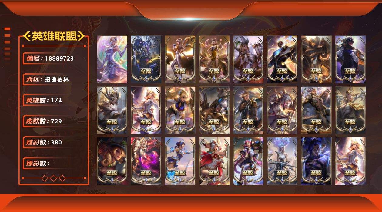 【697021】[18889723]1终极 43神话 92限定 73传说 145史诗 729皮肤 380炫彩 172英雄 可二次 可修改实名 【至臻】至臻 魅惑女巫 厄运小姐(2022),至臻 K/DA 阿狸(2022),至臻 青花瓷 千珏,至臻 魔域梦魇 泽丽,至臻 K/DA 卡莎,至臻 K/DA 阿狸,至臻 魅惑女巫 厄运小姐,至臻 未来战士 锤石,至臻 王国机神玄武 盖伦,至臻 真实伤害