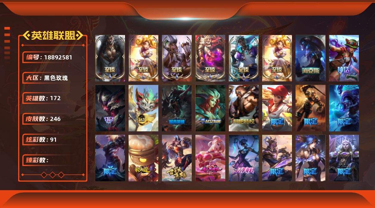 【697605】[18892581]7神话 41限定 20传说 39史诗 246皮肤 91炫彩 172英雄 可二次 可修改实名 【至臻】至臻 狼神英灵 斯维因,至臻 星之守护者 妮寇,至臻 魅惑女巫 厄运小姐,至臻 神龙尊者均衡之龙 沃利贝尔,至臻 星之守护者 艾克,至臻 星之守护者 妮蔻【海克斯】海克斯 玛尔扎哈【限定】玉剑传说 舞龙卫【情人节限定】甜心宝贝 娑娜,幽梦玫瑰 伊莉丝【赛季限定皮