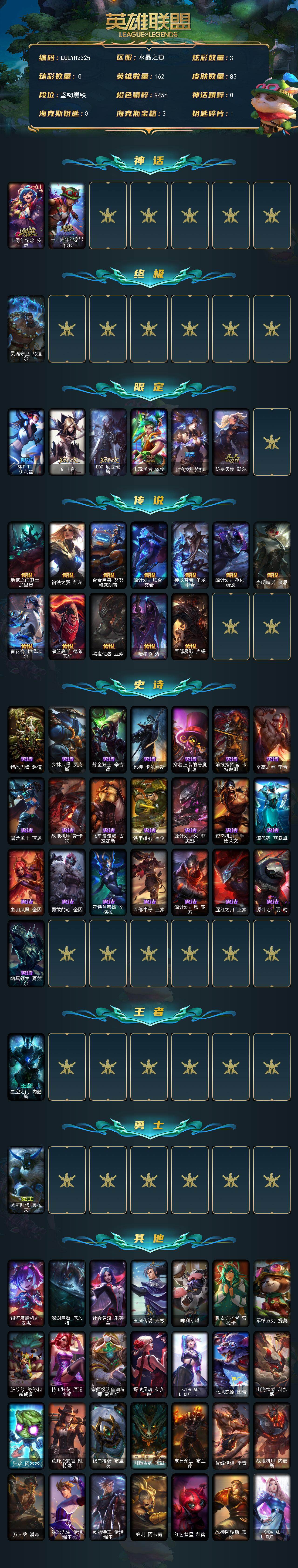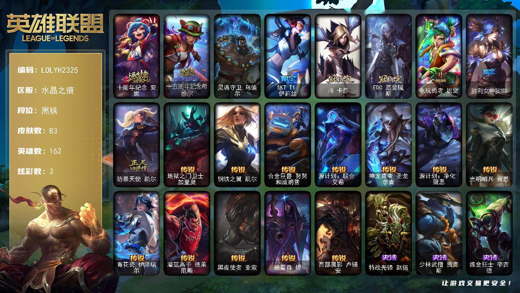 【697841】【LOLYH2325】162英雄/83皮肤/1终极/2神话/6限定/3炫彩/12传说/22史诗/黑铁/十周年纪念安妮/十五周年纪念希维尔/灵魂守卫乌迪尔/SKTT1伊莉丝/IG卡莎/EDG厄斐琉斯/电玩勇者锐雯/胜利女神娑娜/防暴天使凯尔/地狱之门卫士加里奥/钢铁之翼凯尔/合金巨兽努努和威朗普/源计划:联合艾希/神龙尊者圣龙李青/源计划:净化薇恩/光明哨兵薇恩/青花瓷伊泽瑞尔/灌
