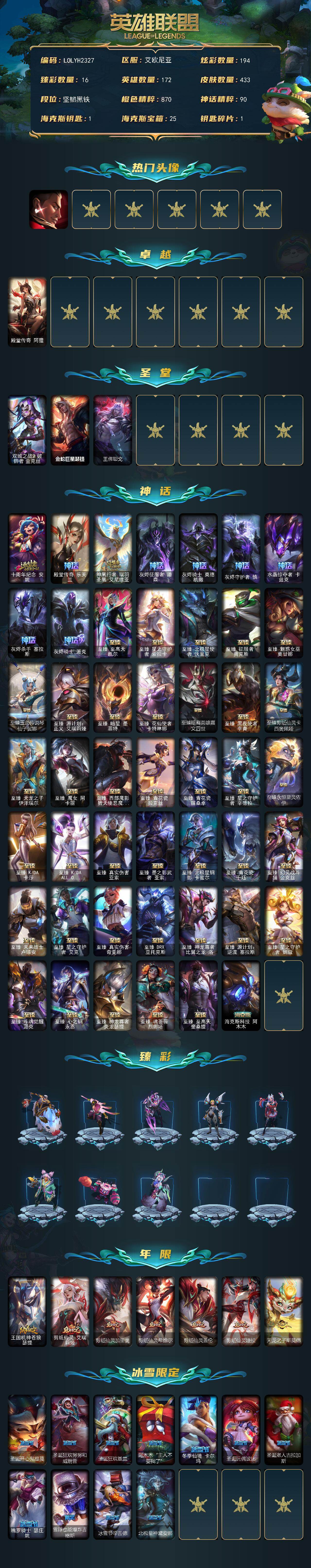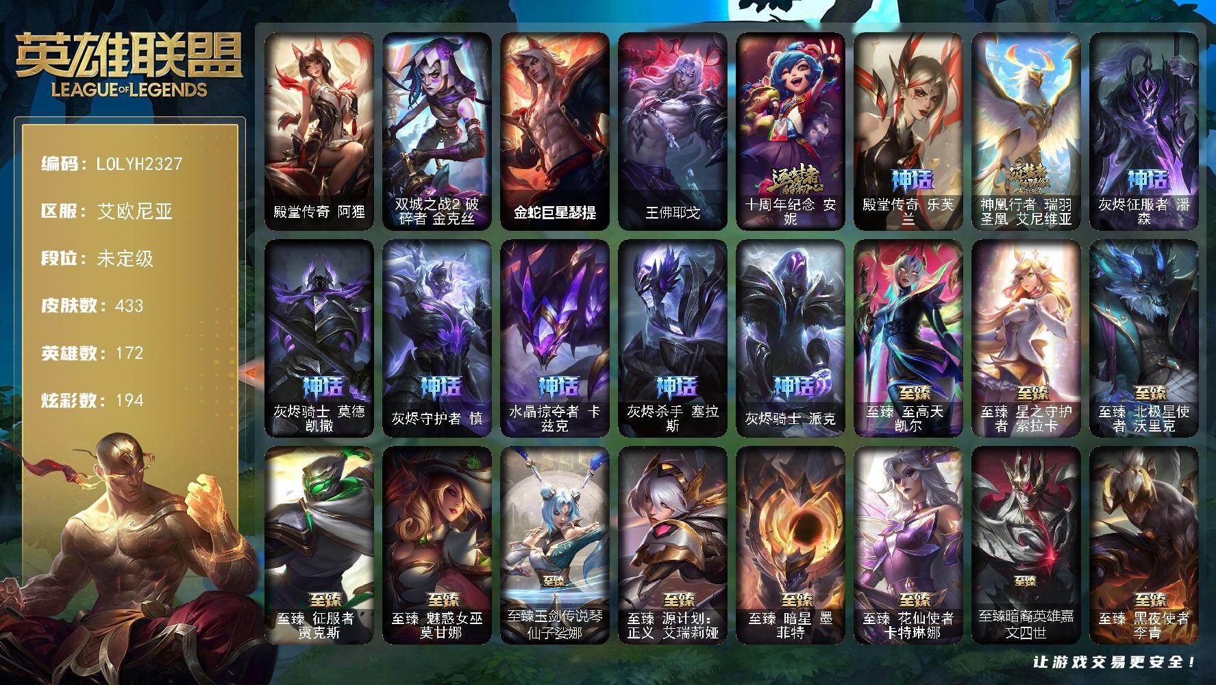 【697852】【LOLYH2327】172英雄/433皮肤/2终极/48神话/67限定/16臻彩/194炫彩/45传说/57史诗/未定级/觅心游侠卢锡安/殿堂传奇阿狸/双城之战2破碎者金克丝/金蛇巨星瑟提/王佛耶戈/十周年纪念安妮/殿堂传奇乐芙兰/神凰行者瑞羽凤凰艾尼维亚/灰烬征服者潘森/灰烬骑士莫德凯撒/灰烬守护者慎/水晶掠夺者卡兹克/灰烬杀手塞拉斯/灰烬骑士派克/至臻至高天凯尔/至臻星之守