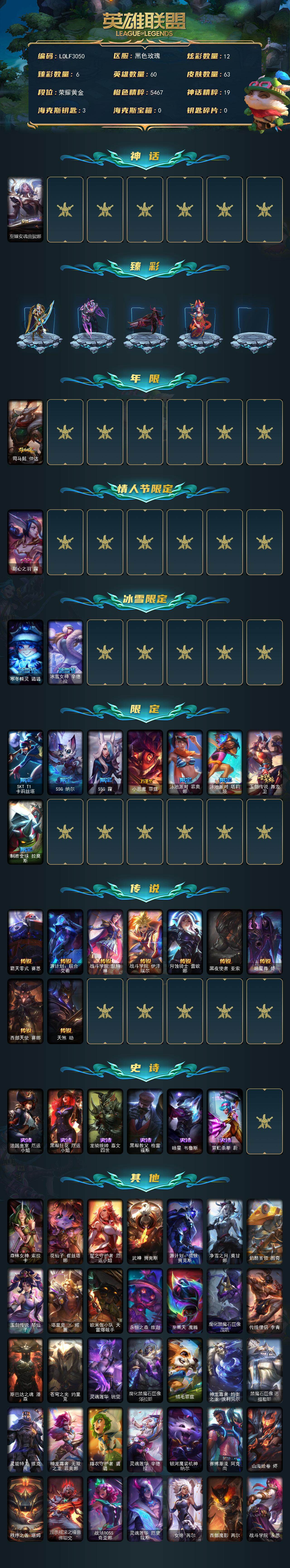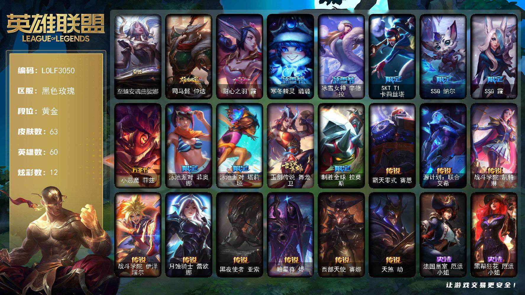 【697878】【LOLF3050】60英雄/63皮肤/1神话/12限定/6臻彩/12炫彩/9传说/6史诗/黄金/至臻安魂曲娑娜/冠军之箭艾希凯旋圣装/天煞劫恒星游历者/西部天使赛娜贝利尔之怠/灵魂莲华卡西奥佩娅流火/墨之影武者永恩灵墨刻影/司马懿仲达/甜心之羽霞/寒冬精灵璐璐/冰雪女神辛德拉/SKTT1卡莉丝塔/SSG纳尔/SSG霞/小恶魔菲兹/泳池派对菲奥娜/泳池派对塔莉垭/玉剑传说舞龙卫/
