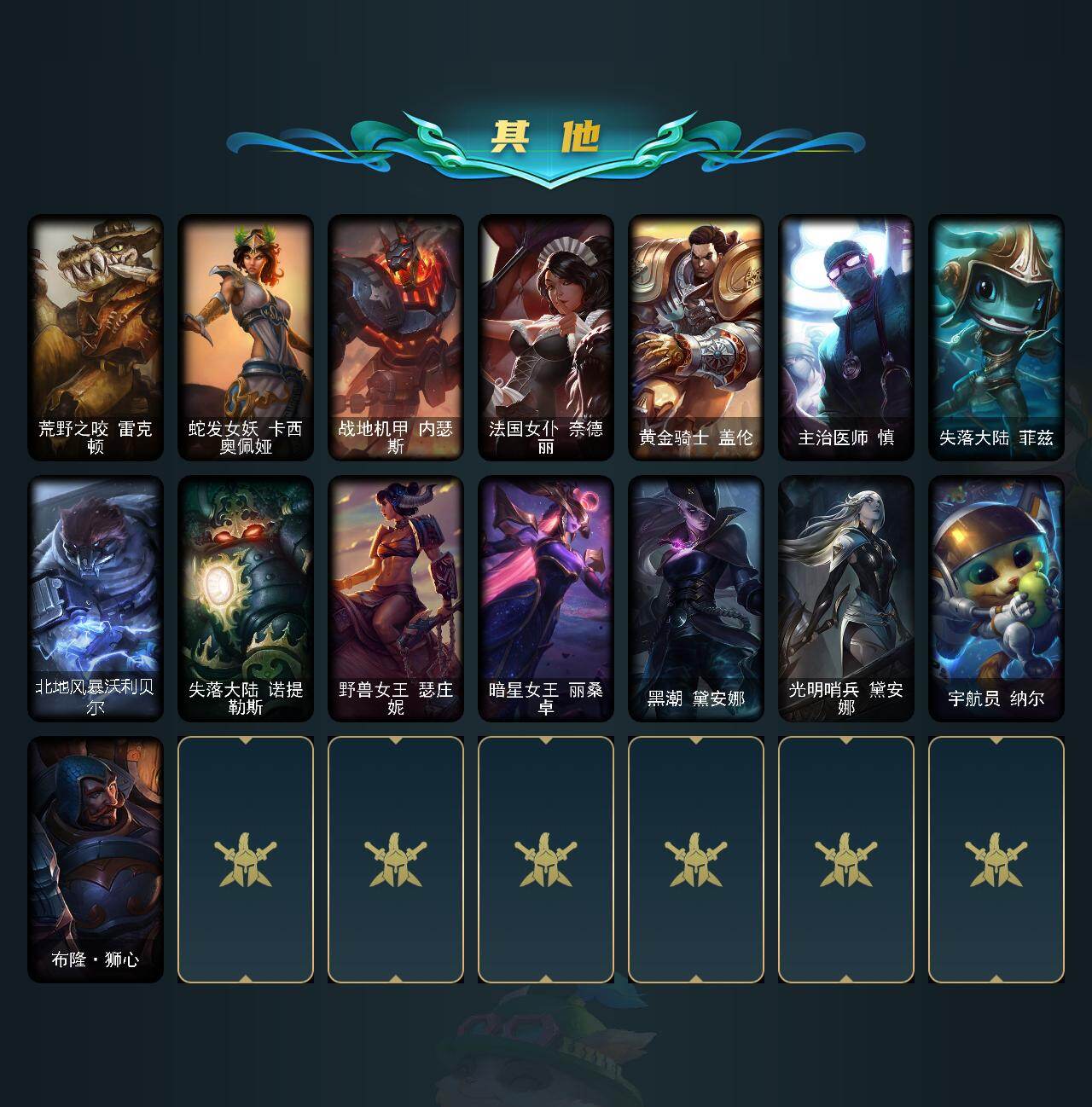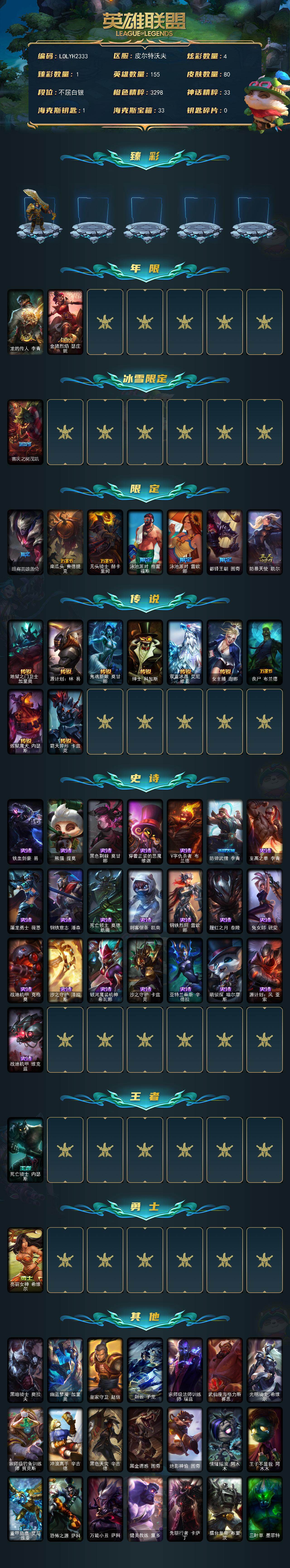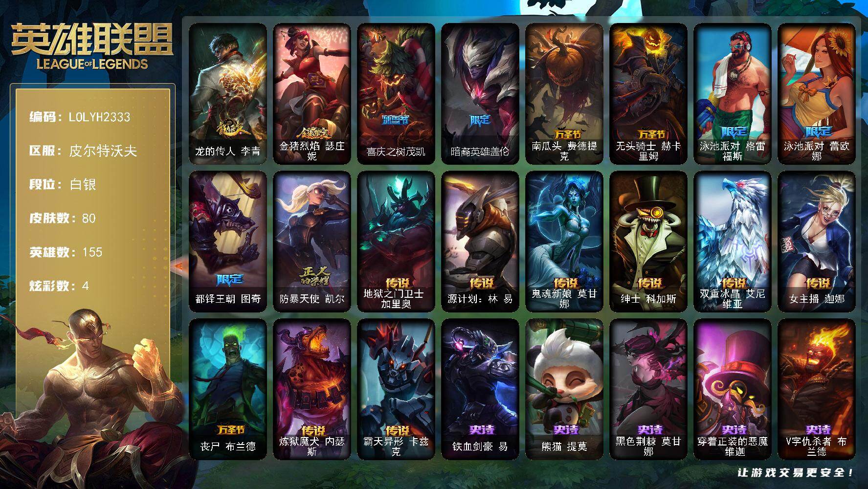 【697931】【LOLYH2333】155英雄/80皮肤/11限定/1臻彩/4炫彩/9传说/22史诗/白银/张辽文远炫金将军/龙的传人李青/金猪烈焰瑟庄妮/喜庆之树茂凯/暗裔英雄盖伦/南瓜头费德提克/无头骑士赫卡里姆/泳池派对格雷福斯/泳池派对蕾欧娜/都铎王朝图奇/防暴天使凯尔/地狱之门卫士加里奥/源计划:林易/鬼魂新娘莫甘娜/绅士科加斯/双重冰晶艾尼维亚/女主播迦娜/丧尸布兰德/炼狱魔犬内瑟