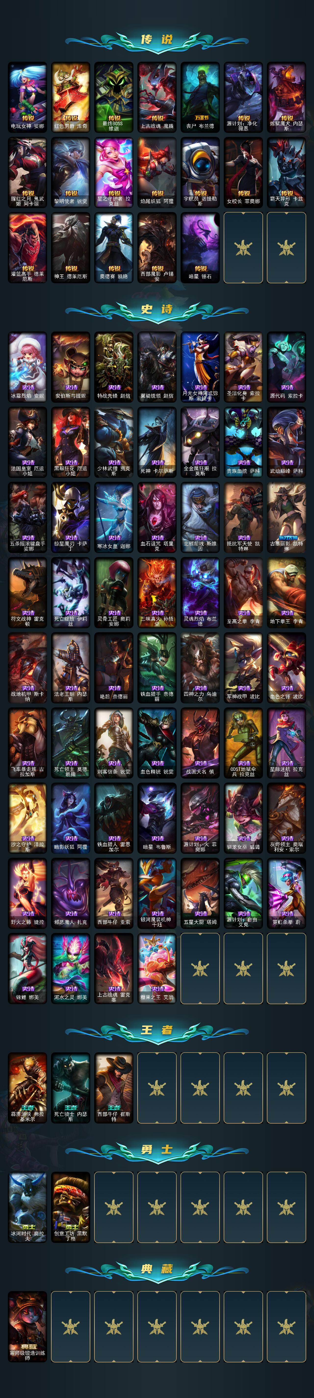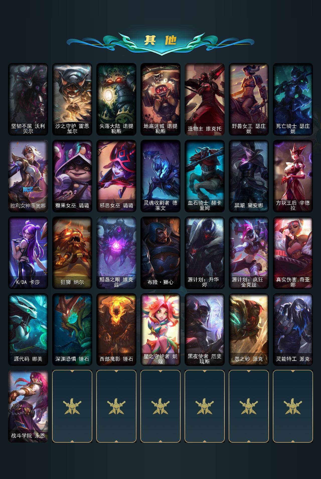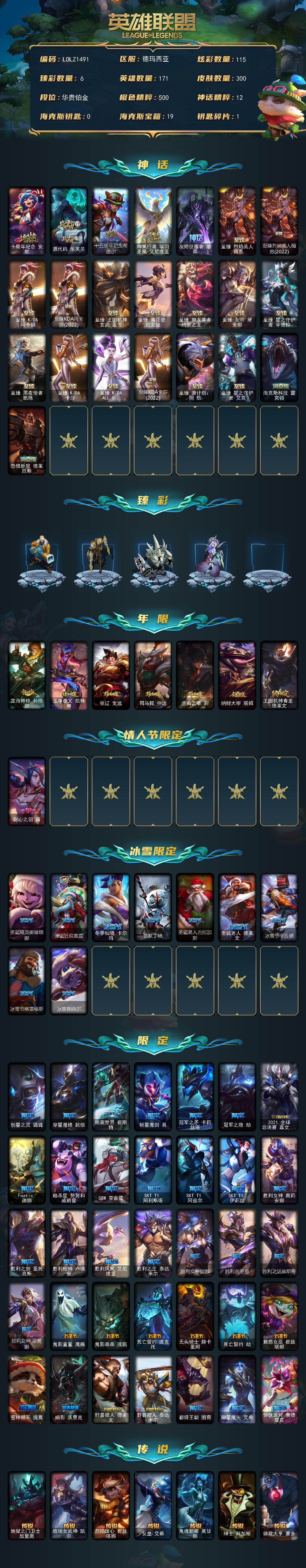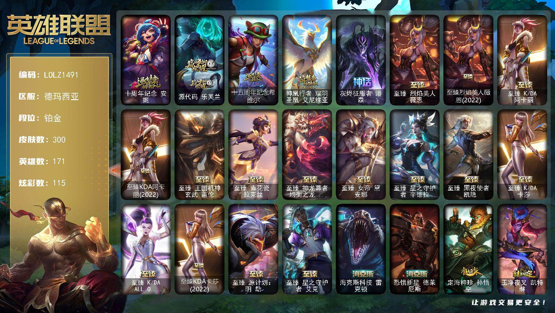 【698100】【LOLZ1491】171英雄/300皮肤/22神话/53限定/6臻彩/115炫彩/26传说/60史诗/铂金/十周年纪念安妮/源代码乐芙兰/十五周年纪念希维尔/神凰行者瑞羽凤凰艾尼维亚/灰烬征服者潘森/至臻烈焰美人薇恩/至臻烈焰美人薇恩(2022)/至臻K/DA阿卡丽/至臻KDA阿卡丽(2022)/至臻王者机甲玄武盖伦/至臻青花瓷拉克丝/至臻神龙尊者均衡之龙沃利贝尔/至臻女帝黛安