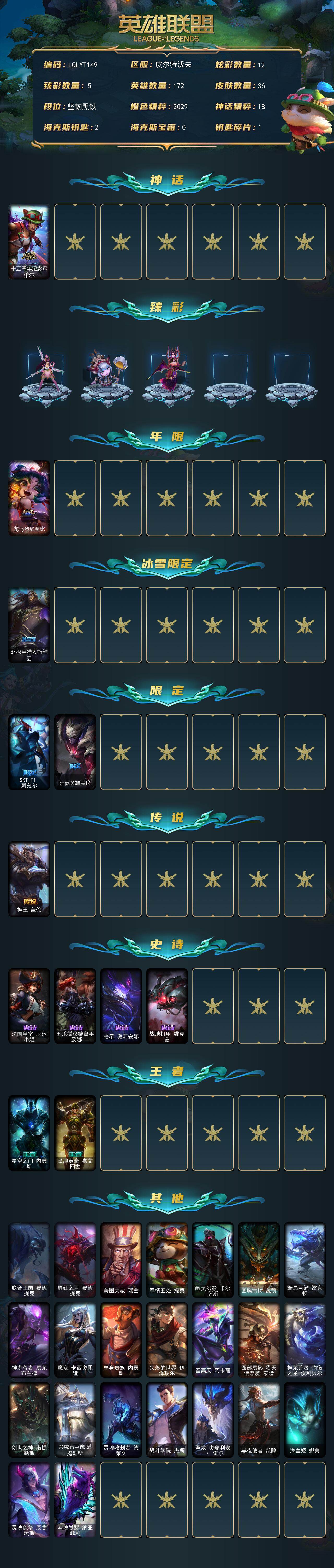 【698125】【LOLYT149】172英雄/36皮肤/1神话/5限定/5臻彩/12炫彩/1传说/4史诗/未定级/十五周年纪念希维尔/斗魂觉醒拉克丝无限斗志/玉剑传说舞剑仙承影/咖啡甜心璐璐焦糖布丁/星之吞噬者莫甘娜热情之末/霸天异形卡兹克黄金异端/龙马烈焰波比/北极星猎人斯维因/SKTT1阿兹尔/暗裔英雄盖伦/神王盖伦/法国皇室厄运小姐/五杀摇滚键盘手娑娜/暗星奥莉安娜/战地机甲维克兹/星空