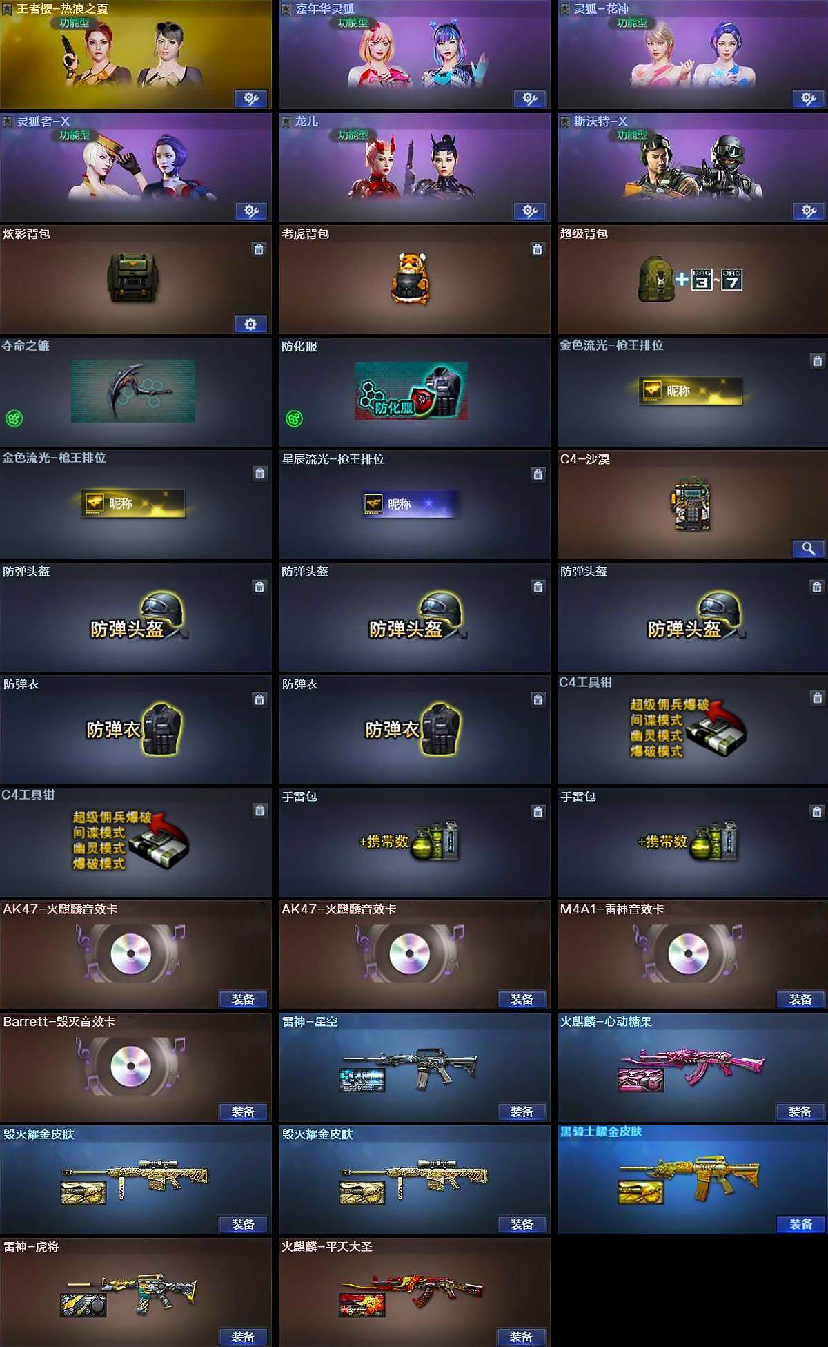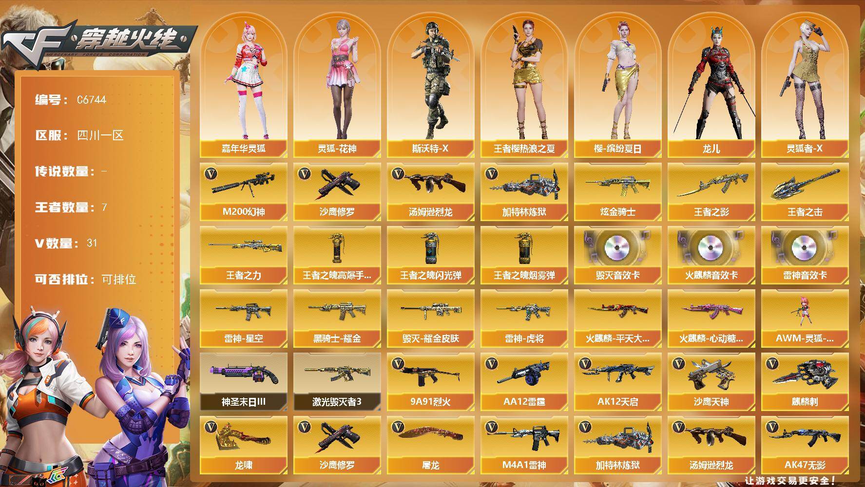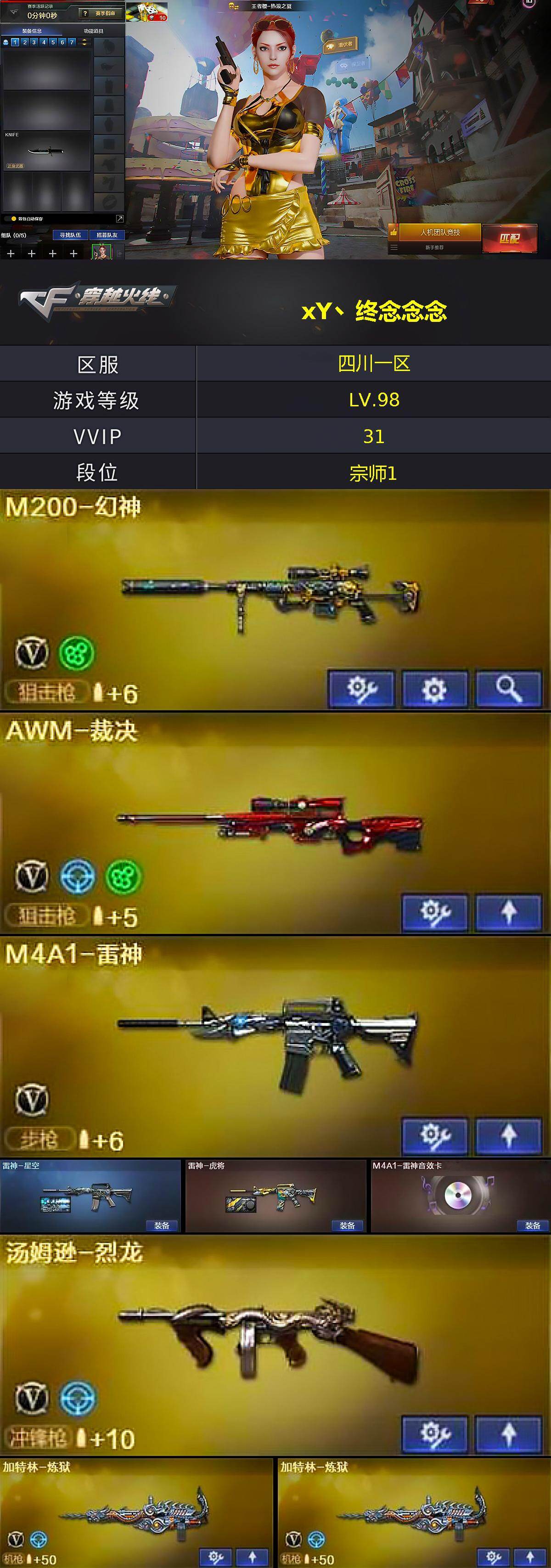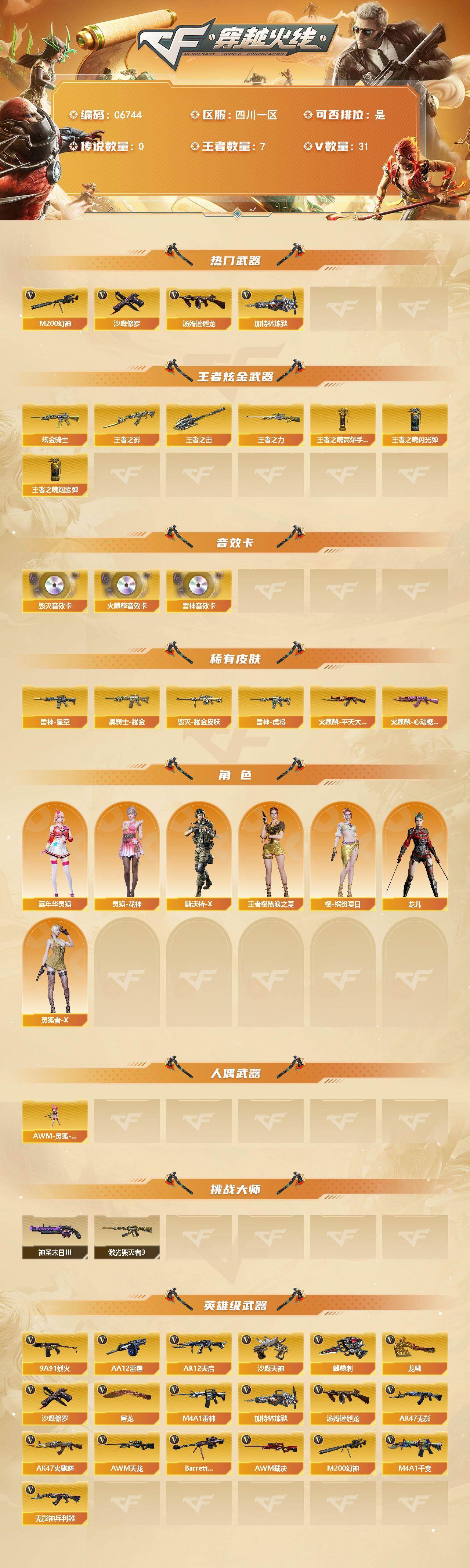 【698858】【C6744】四川一区-31V-7王者武器数-1炫金武器数【热门武器】:M200-幻神,汤姆逊-烈龙,加特林-炼狱*2,沙鹰-修罗*4【王者炫金武器】:王者之影,王者之力,王者之击,王者之魄高爆手雷,王者之魄闪光弹*2,王者之魄烟雾弹,炫金骑士【音效卡】:AK47-火麒麟音效卡*2,M4A1-雷神音效卡,Barrett-毁灭音效卡【皮肤】:雷神-星空,雷神-虎将,火麒麟-平天大圣