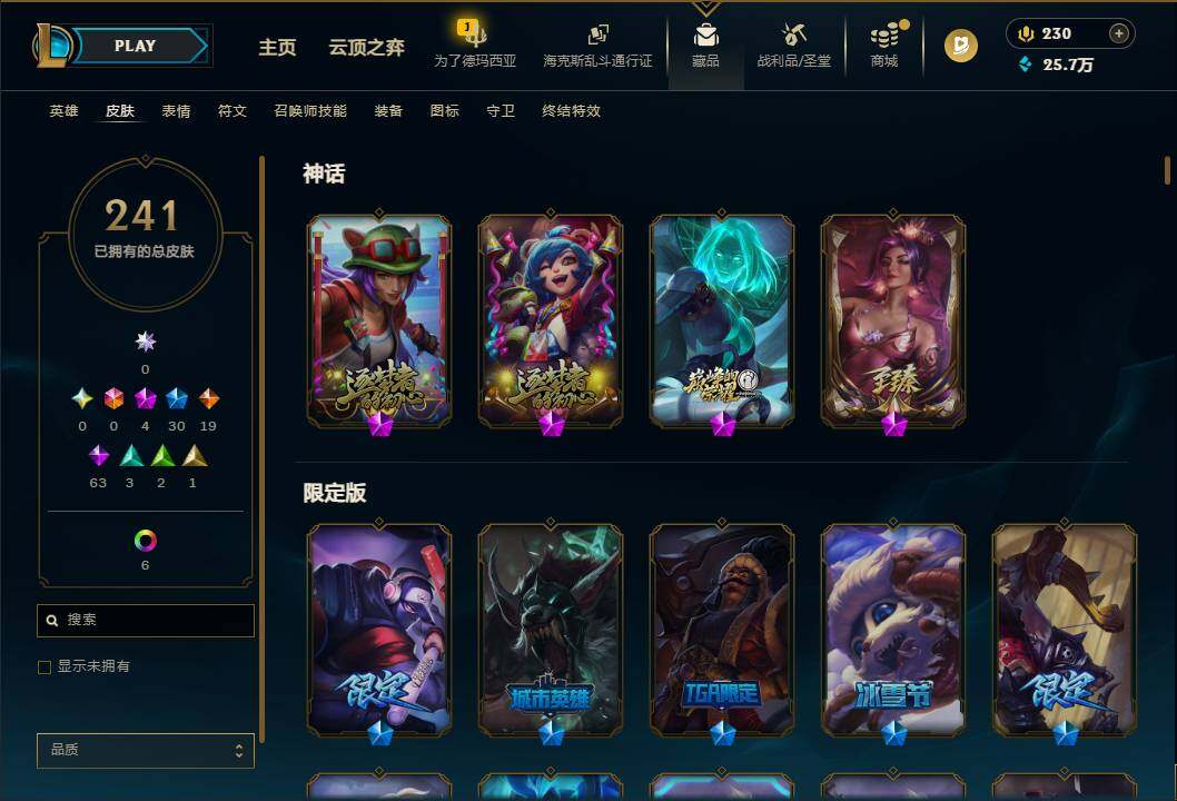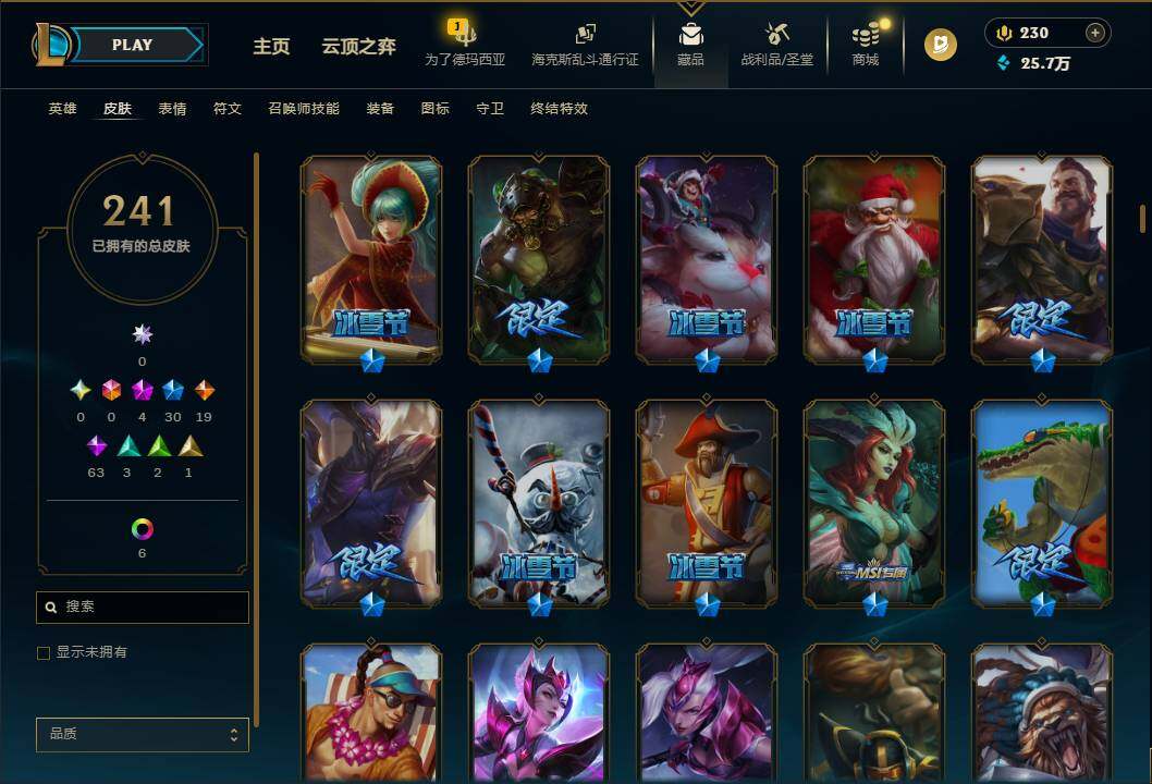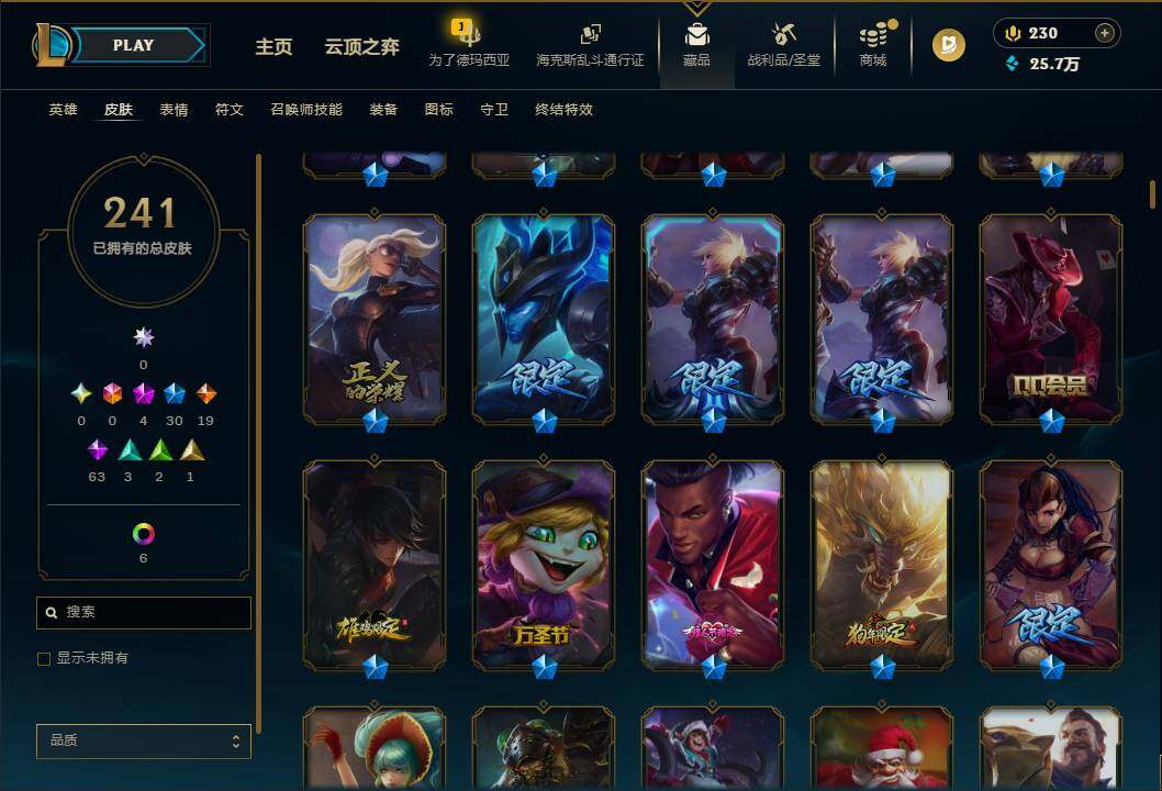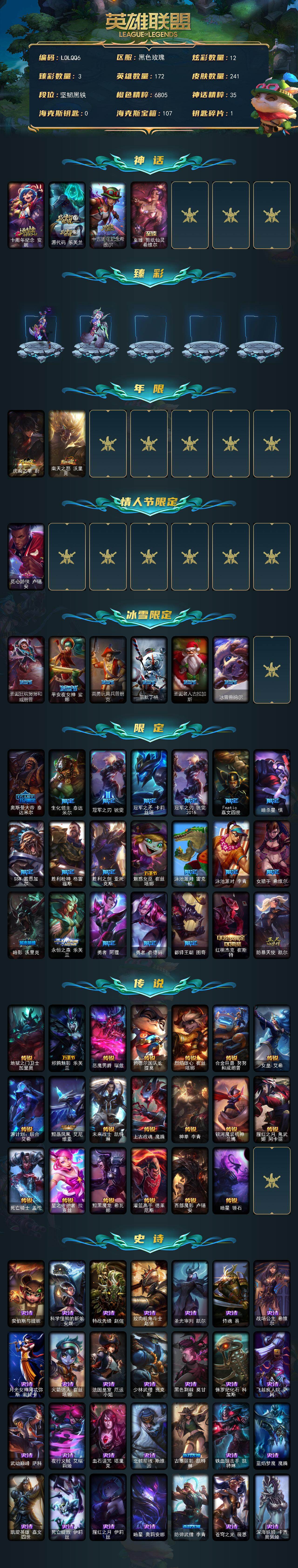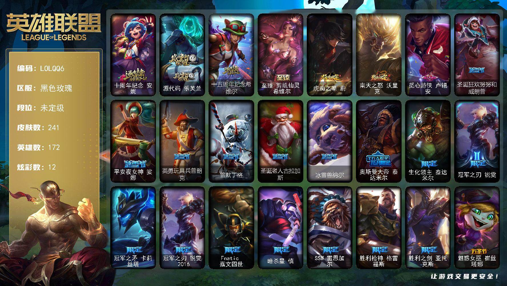 【698936】【LOLQQ6】172英雄/241皮肤/4神话/30限定/3臻彩/12炫彩/20传说/63史诗/未定级/十周年纪念安妮/源代码乐芙兰/十五周年纪念希维尔/至臻剪纸仙灵希维尔/星之守护者金克丝黑洞/魔女阿卡丽虚荣/净雪之月莫甘娜冬虹/虎痴之拳蔚/南天之怒沃里克/觅心游侠卢锡安/圣诞狂欢努努和威朗普/平安夜女神娑娜/英勇玩具兵普朗克/雪默丁格/圣诞老人古拉加斯/冰雪兽纳尔/奥斯曼大帝