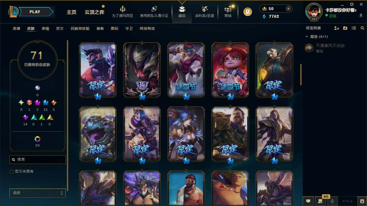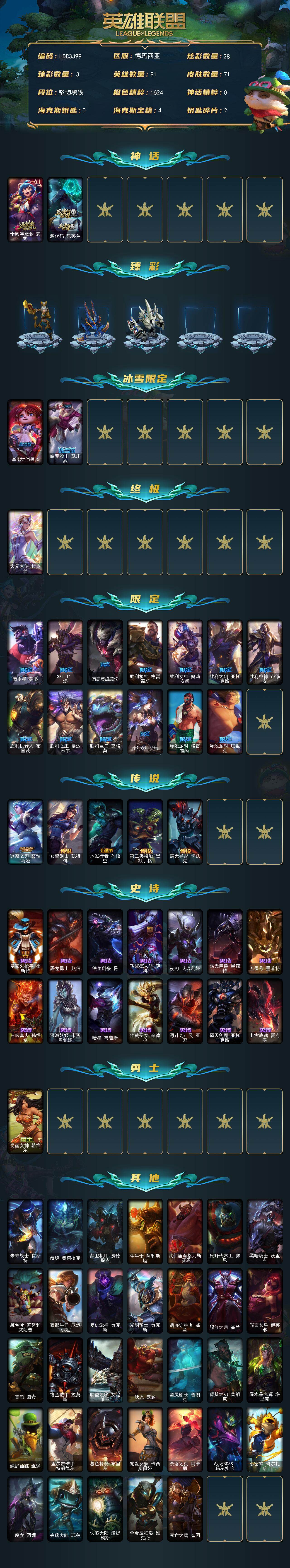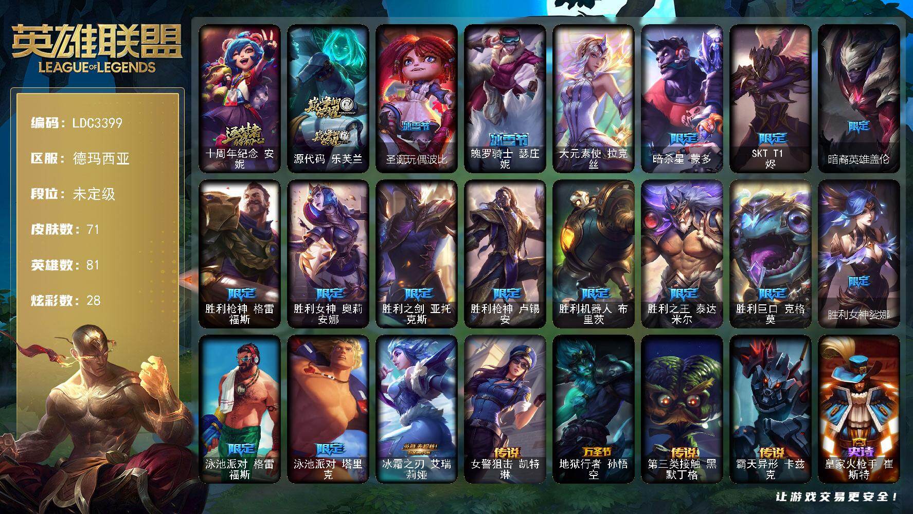 【699236】【LDC3399】81英雄/71皮肤/1终极/2神话/15限定/3臻彩/28炫彩/5传说/14史诗/未定级/十周年纪念安妮/源代码乐芙兰/替父从军花木兰炫金龙刃/霸天异形卡兹克掠空魅影/霸天巨兽雪崩墨菲特/圣诞玩偶波比/魄罗骑士瑟庄妮/大元素使拉克丝/暗杀星蒙多/SKTT1烬/暗裔英雄盖伦/胜利枪神格雷福斯/胜利女神奥莉安娜/胜利之剑亚托克斯/胜利枪神卢锡安/胜利机器人布里茨/胜