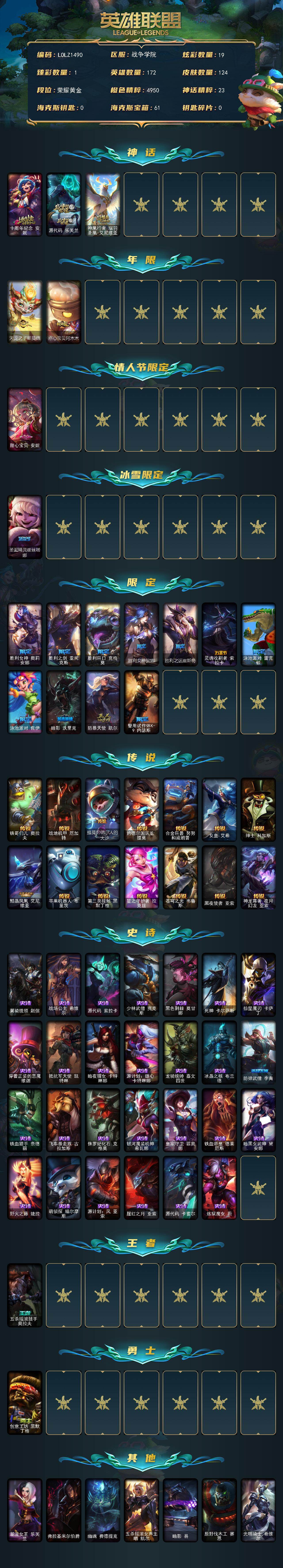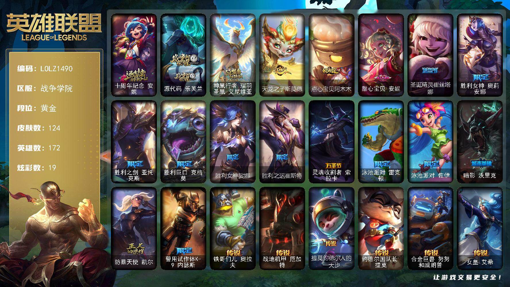 【699750】【LOLZ1490】172英雄/124皮肤/3神话/15限定/1臻彩/19炫彩/14传说/27史诗/黄金账号等级:378/十周年纪念安妮/源代码乐芙兰/神凰行者瑞羽凤凰艾尼维亚/魔女阿卡丽虚荣/天龙之子斯莫德/点心宝贝阿木木/甜心宝贝安妮/圣诞精灵崔丝塔娜/胜利女神奥莉安娜/胜利之剑亚托克斯/胜利巨口克格莫/胜利女神娑娜/胜利之运崔斯特/灵魂收割者索拉卡/泳池派对雷克顿/泳池派对