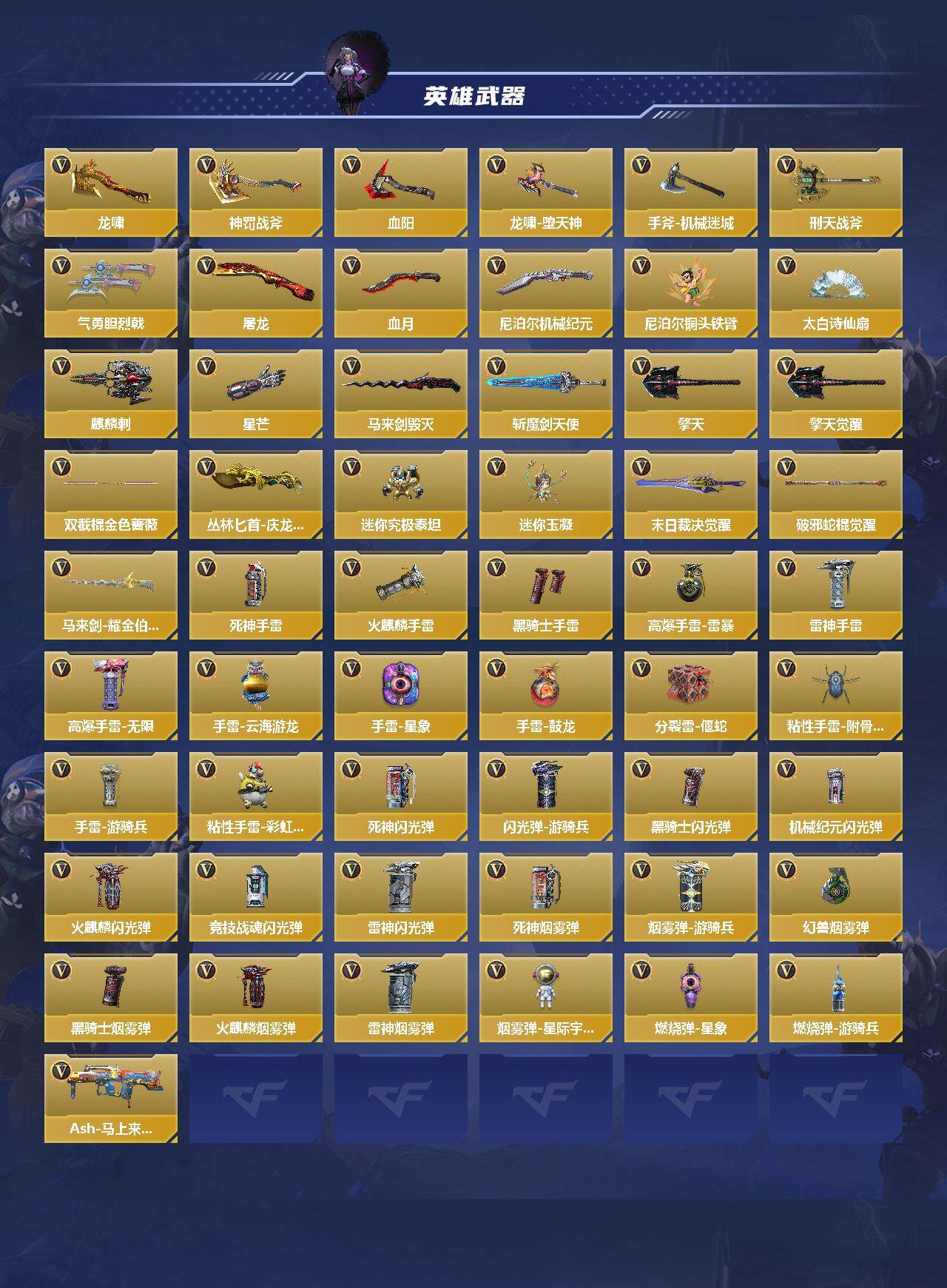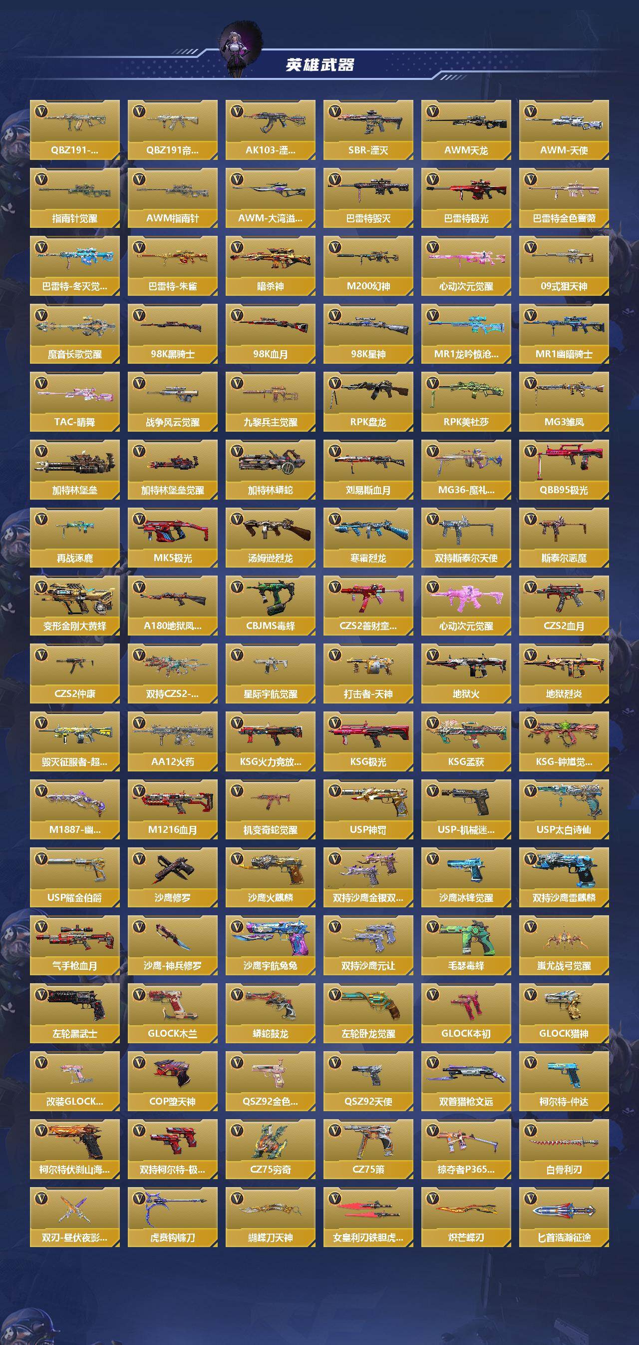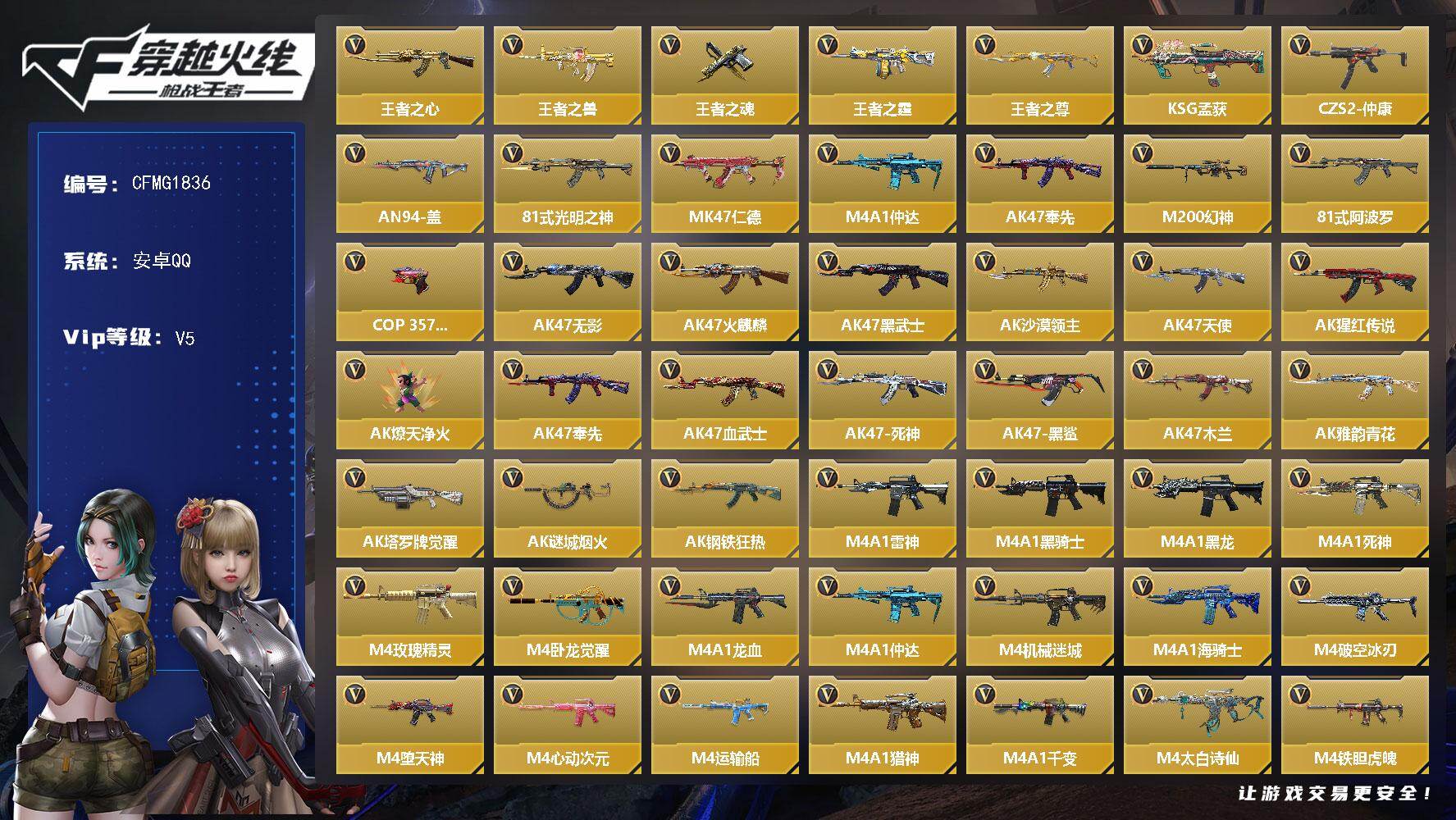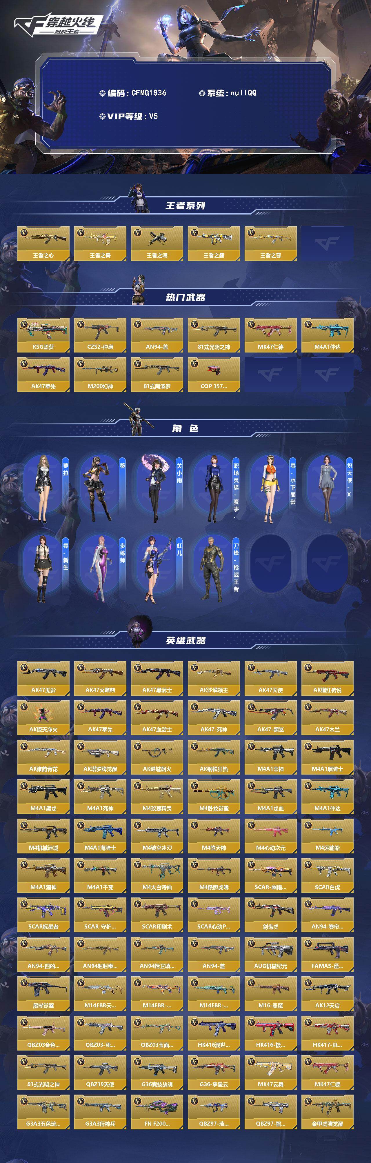 【700027】【CFMG1836】VIP5/385V/王者之心/王者之兽/王者之魂/王者之霆/王者之尊/KSG-孟获/CZS2-仲康/AN94-盖/81式-光明之神/MK47-仁德/M4A1-仲达/AK47-奉先/幻神/81式-阿波罗/COP 357-堕天神/萝拉/葵/关小雨/职场灵狐-赛事经理/零-水下丽影/炽天使-X/零-新生/步练师/虹儿/刀锋-枪战王者/无影/火麒麟/黑武士/AK47-