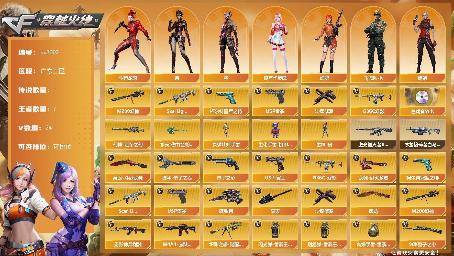 【700100】【700100】广东三区-25V-7王者武器数-0炫金武器数【传说角色】:神威莲华【热门武器】:G36C-幻影,Scar Light-白虎,M
