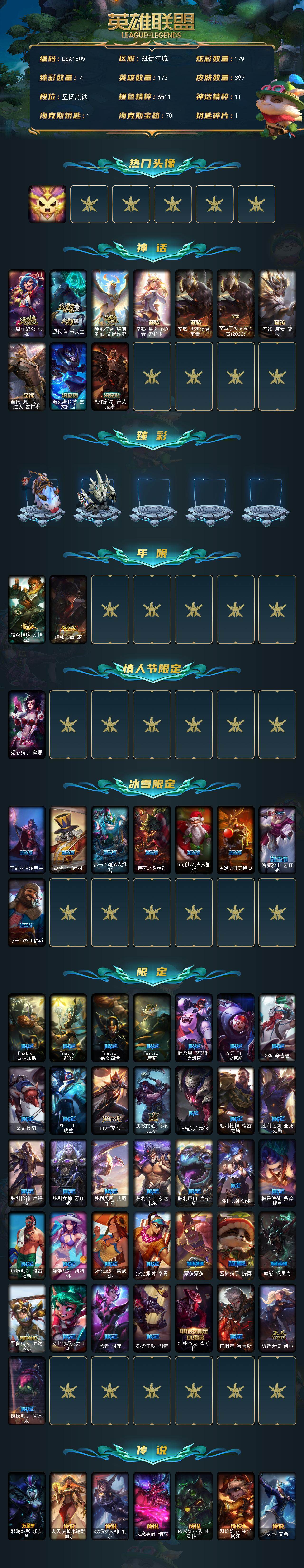 【700491】【LSA1509】172英雄/397皮肤/10神话/48限定/4臻彩/179炫彩/31传说/106史诗/未定级账号等级:889/星守索拉卡/十周年纪念安妮/源代码乐芙兰/神凰行者瑞羽凤凰艾尼维亚/至臻星之守护者索拉卡/至臻黑夜使者李青/至臻黑夜使者李青(2022)/至臻魔女婕拉/至臻源计划:逆流塞拉斯/海克斯科技嘉文四世/恐惧新星德莱厄斯/无畏骑士瑟庄妮赤子初心/霸天巨兽雪崩墨菲
