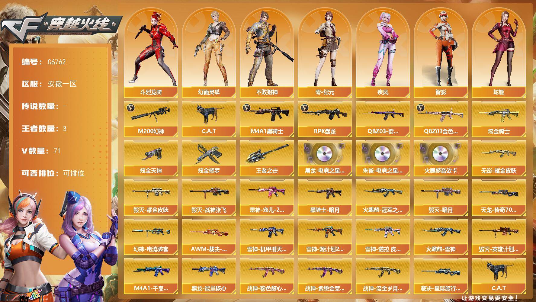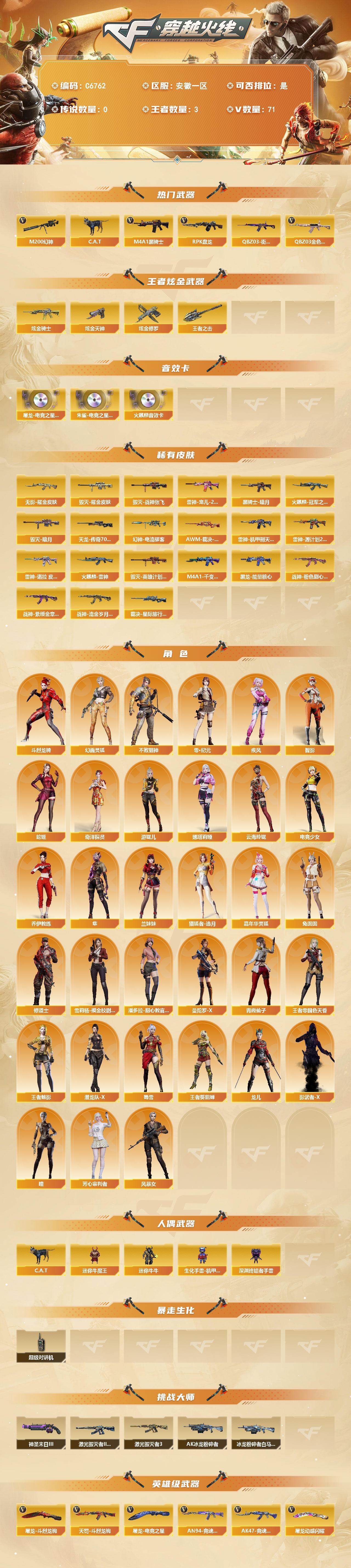 【700641】【700641】【C6762】安徽一区-73V-3王者武器数-4炫金武器数【热门武器】:QBZ03-金色蔷薇*2,M200-幻神,QBZ03-