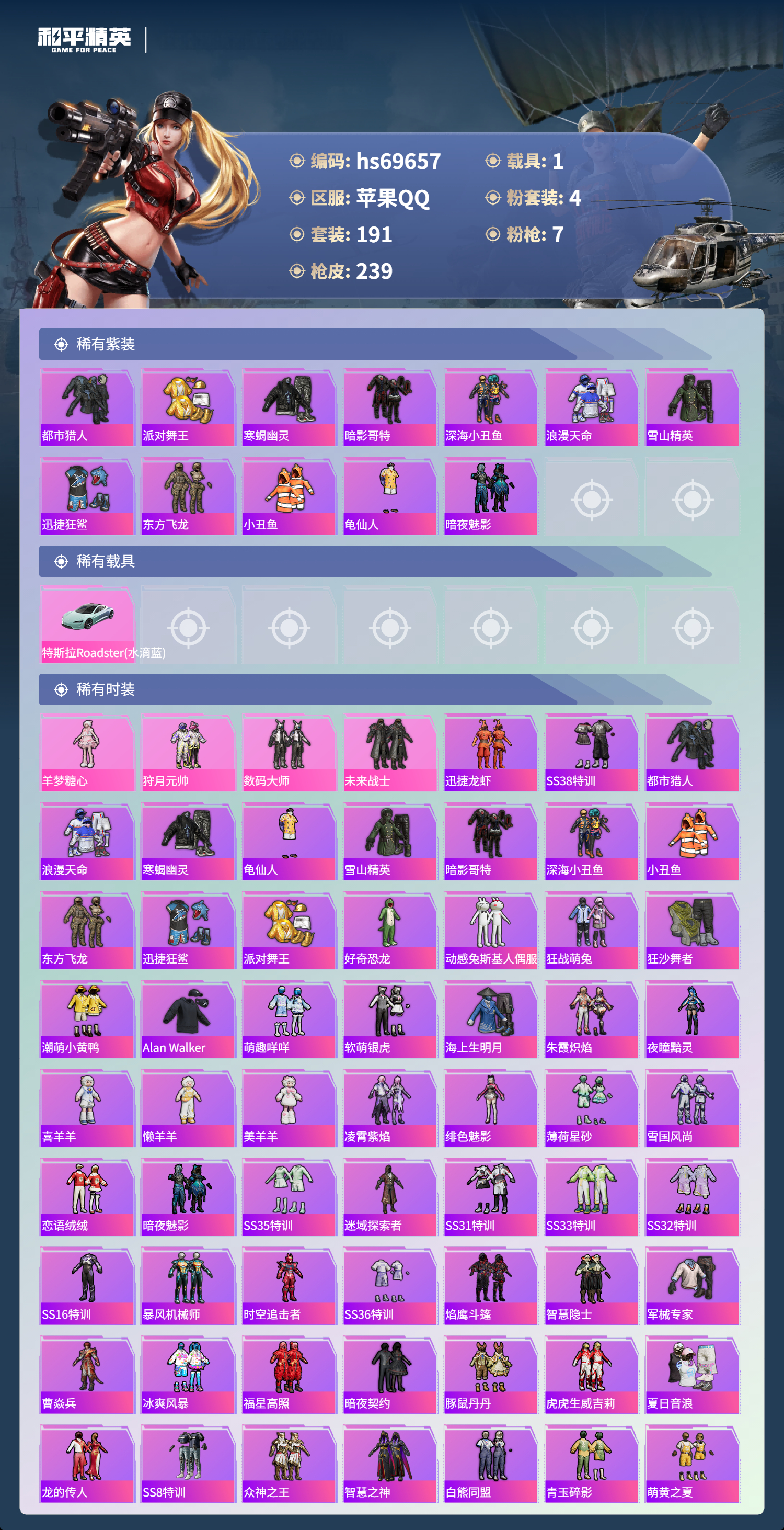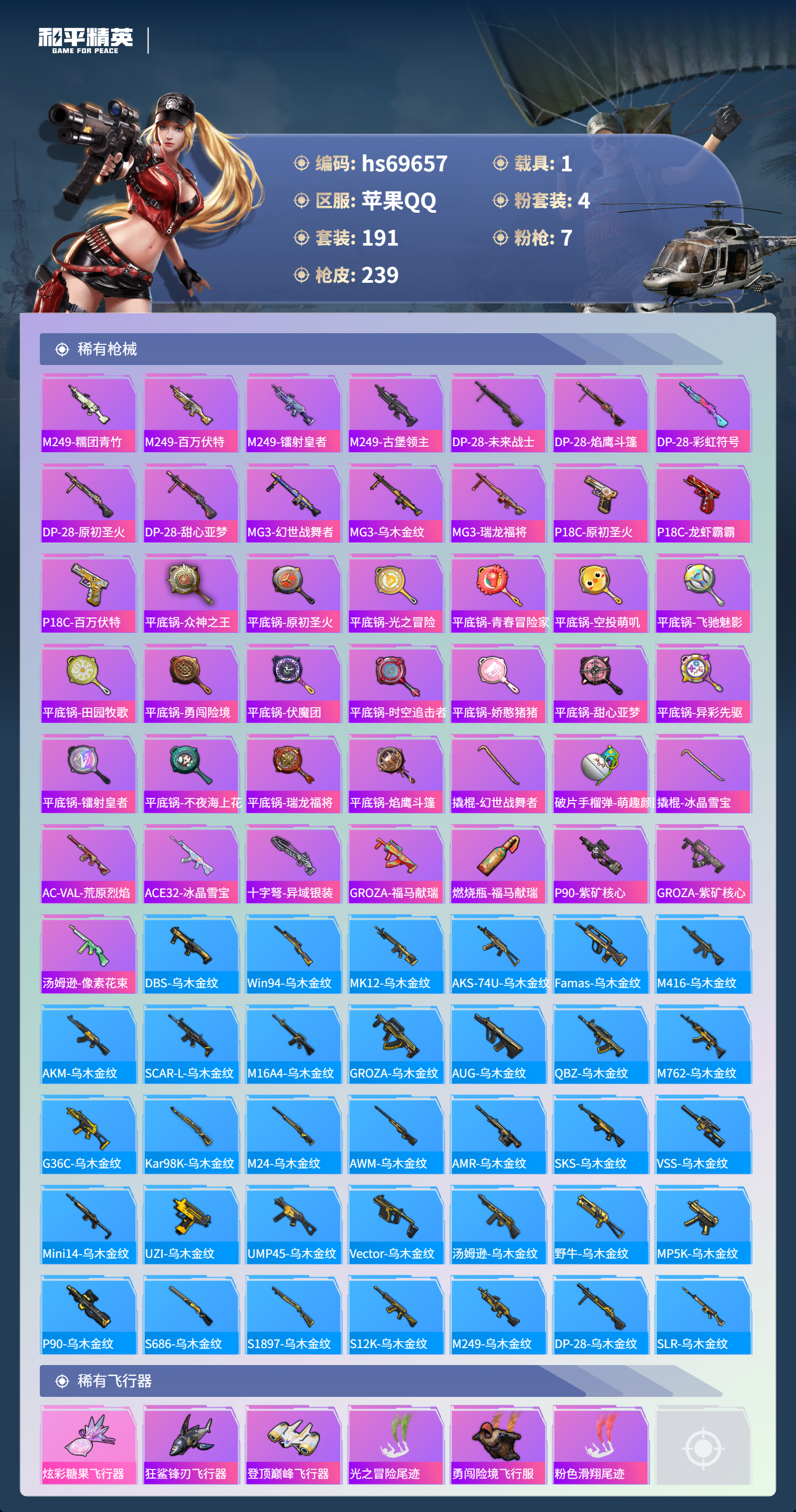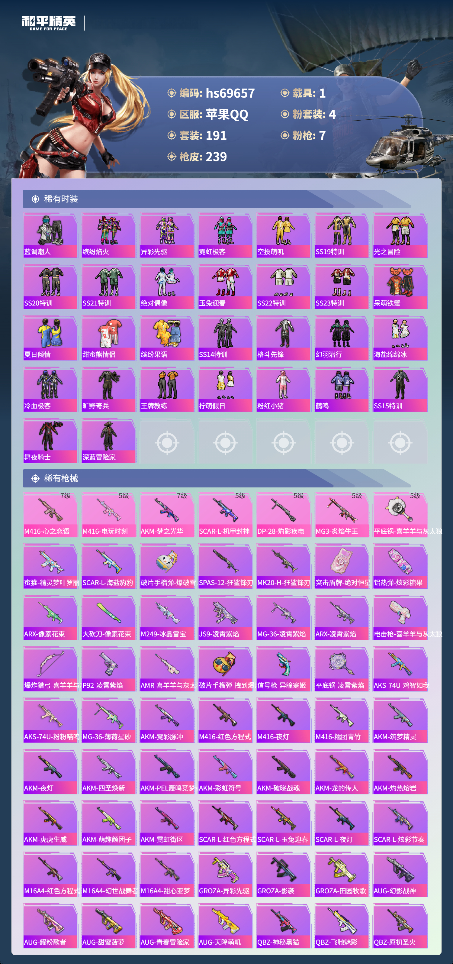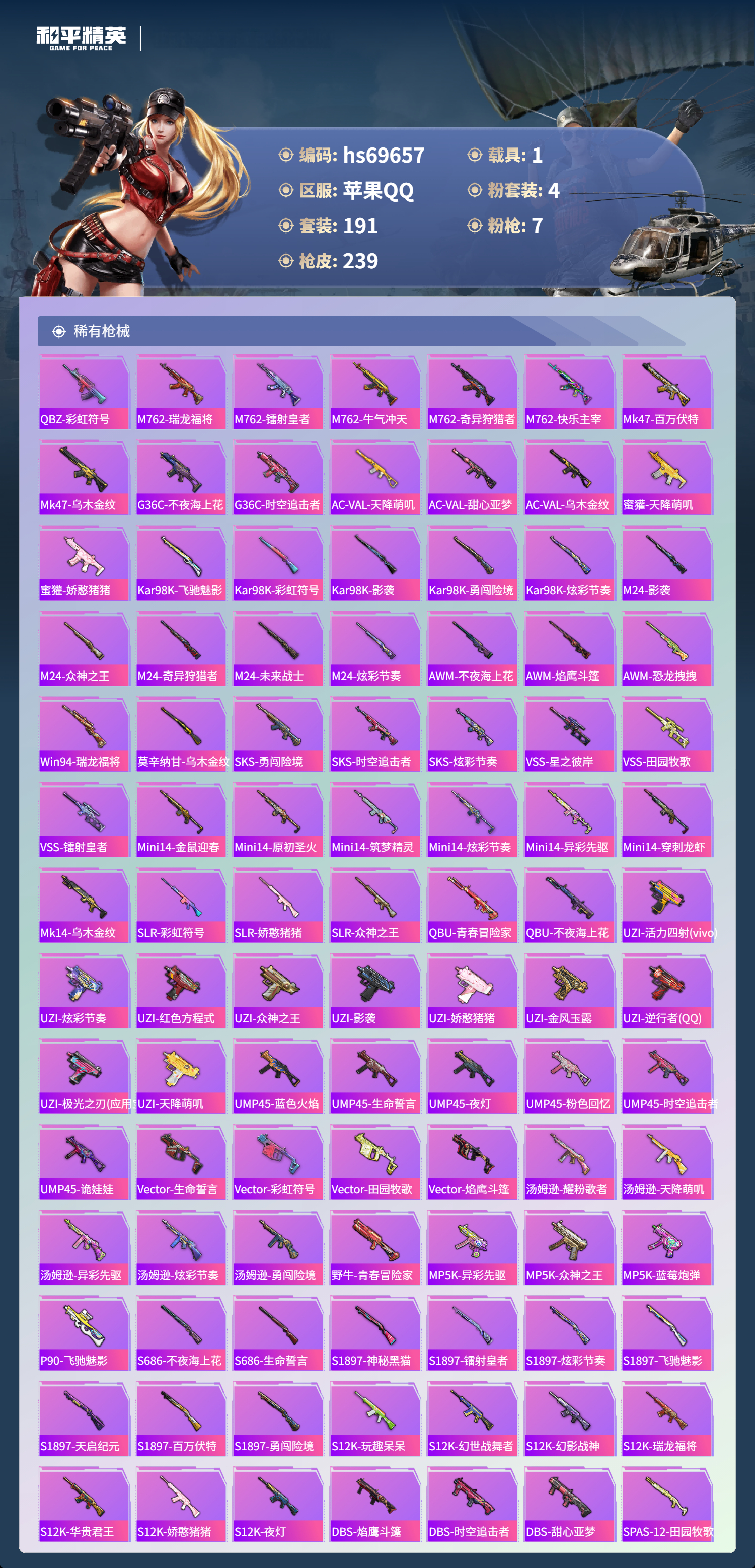 【700657】【不可二次】【苹果QQ】龟仙人 漫步者 粉甜马卡龙 都市猎人 M24-奇异狩猎者 M249-古堡领主 MG3-炙焰牛王 东方飞龙 豚鼠丹丹 M762-奇异狩猎者 M416-电玩时刻 SCAR-L-机甲封神 寒蝎幽灵 M416-心之恋语 深海小丑鱼 瑞龙福将 激萌小黄鸭 特斯拉R水滴蓝 浪漫天命 梦之呓语 团圆交子 软萌银虎 迅捷狂鲨 暗夜契约 M762-瑞龙福将 狩月元帅 潮萌小