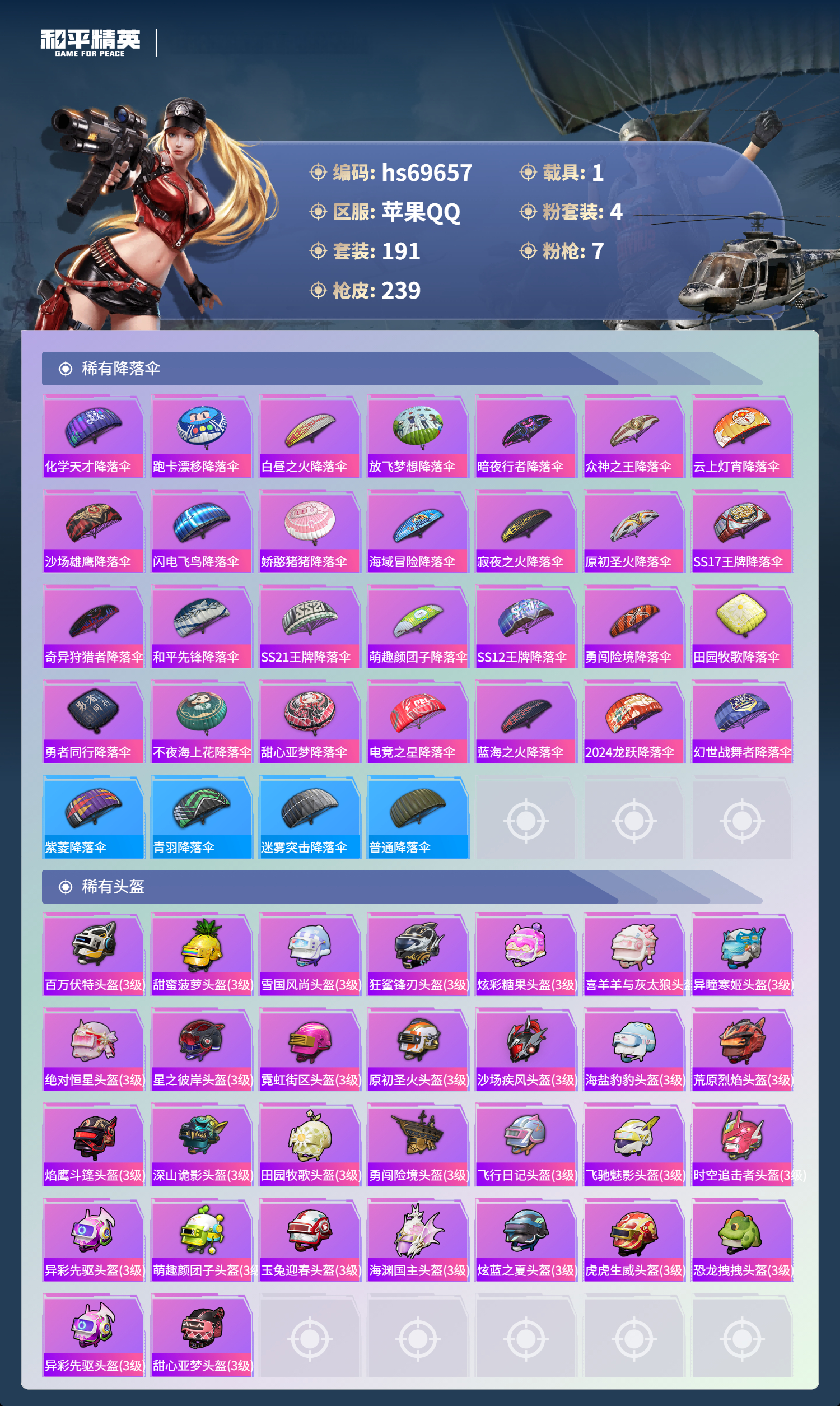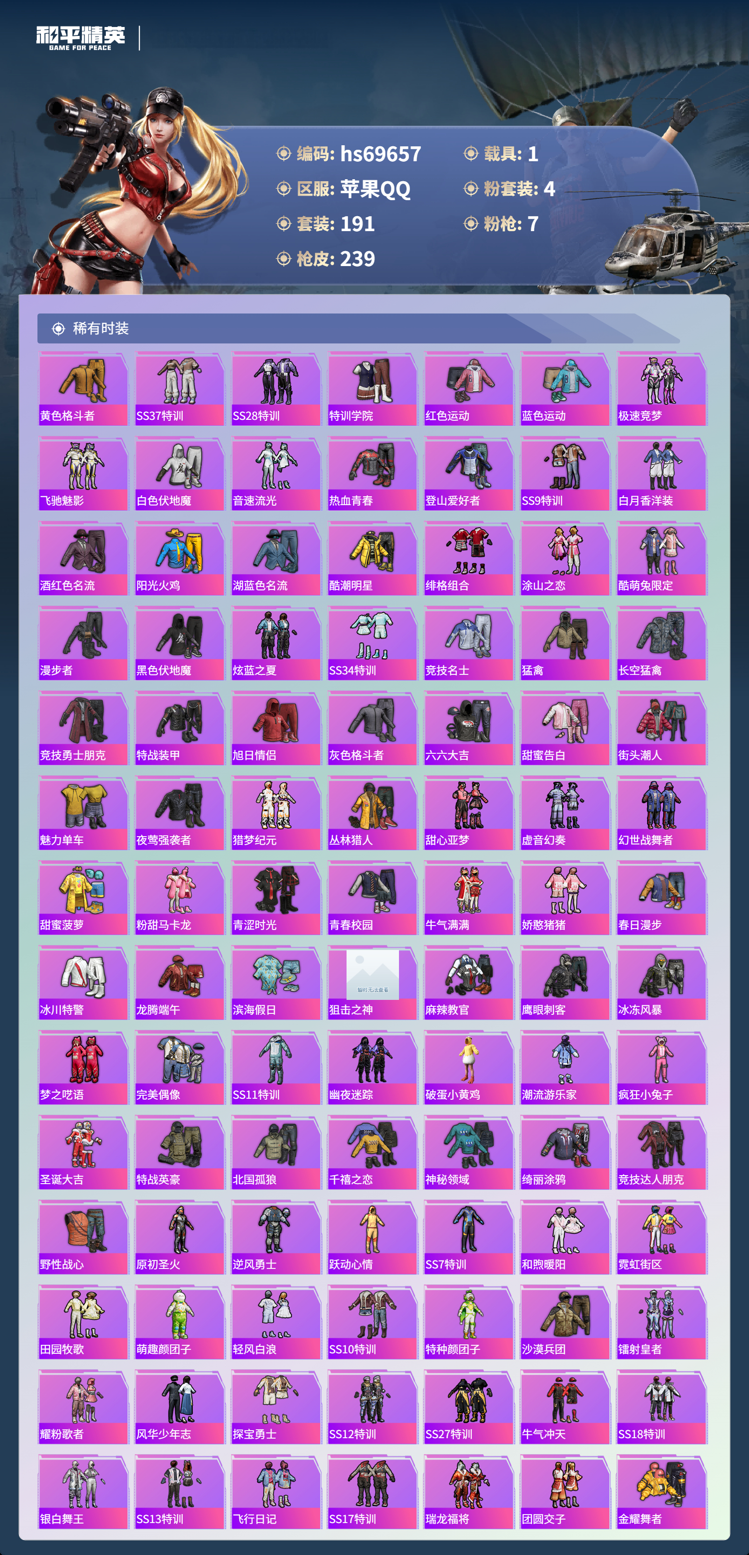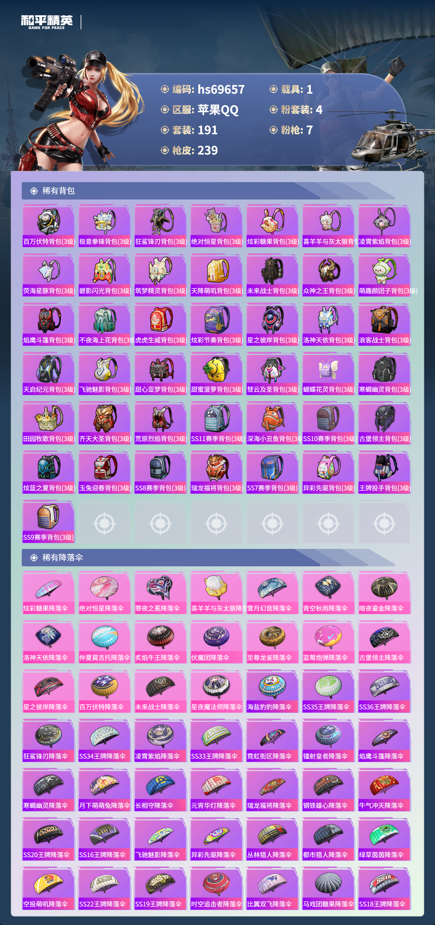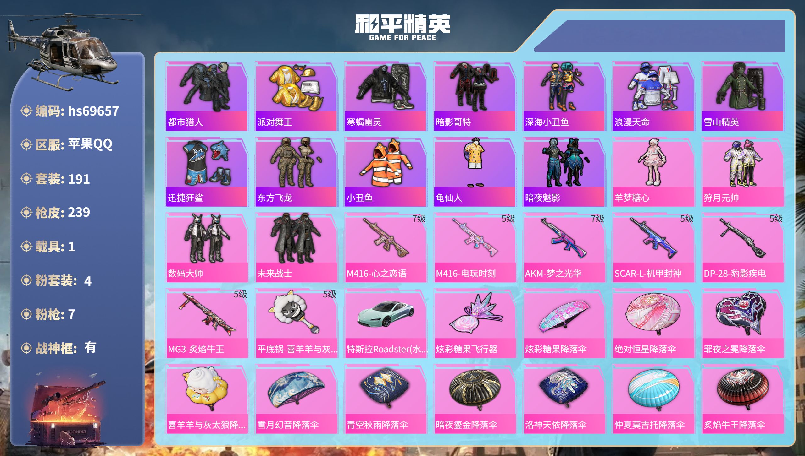 【700657】【不可二次】【苹果QQ】龟仙人 漫步者 粉甜马卡龙 都市猎人 M24-奇异狩猎者 M249-古堡领主 MG3-炙焰牛王 东方飞龙 豚鼠丹丹 M762-奇异狩猎者 M416-电玩时刻 SCAR-L-机甲封神 寒蝎幽灵 M416-心之恋语 深海小丑鱼 瑞龙福将 激萌小黄鸭 特斯拉R水滴蓝 浪漫天命 梦之呓语 团圆交子 软萌银虎 迅捷狂鲨 暗夜契约 M762-瑞龙福将 狩月元帅 潮萌小