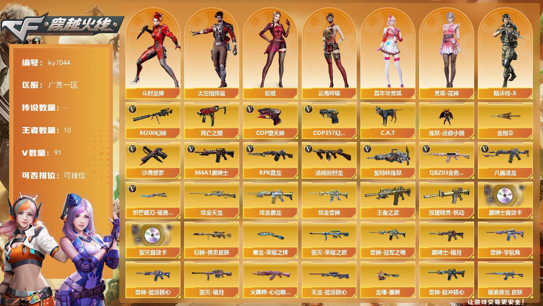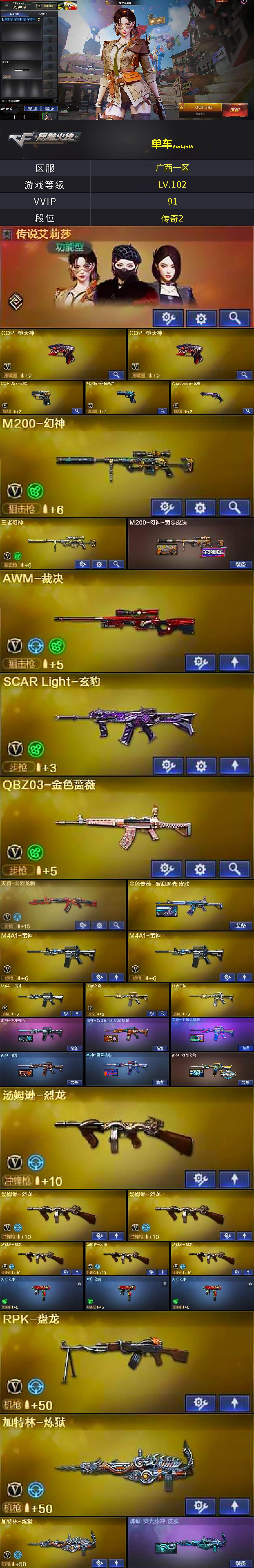 【701026】【701026】广西一区-100V-10王者武器数-3炫金武器数【传说角色】:传说艾莉莎【热门武器】:QBZ03-金色蔷薇,M200-幻神,八