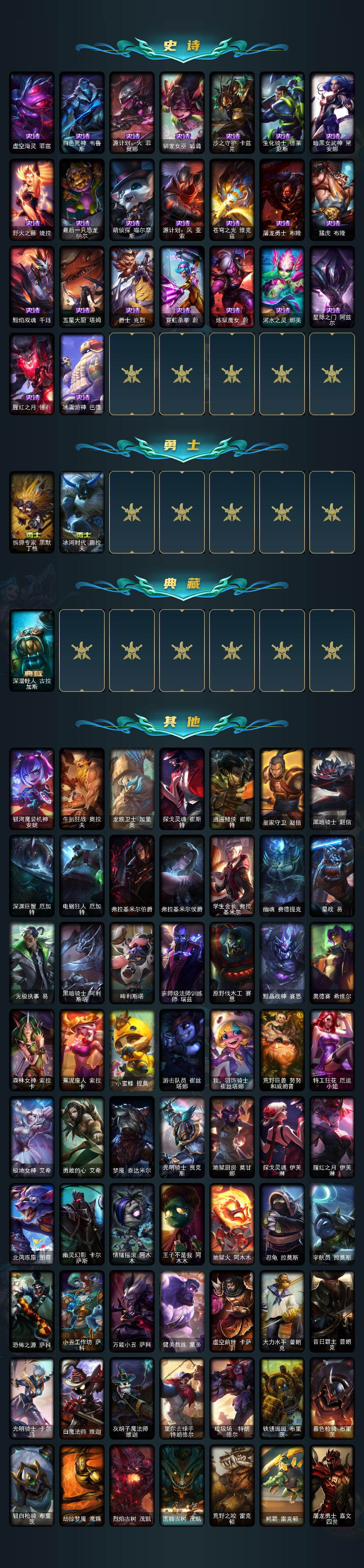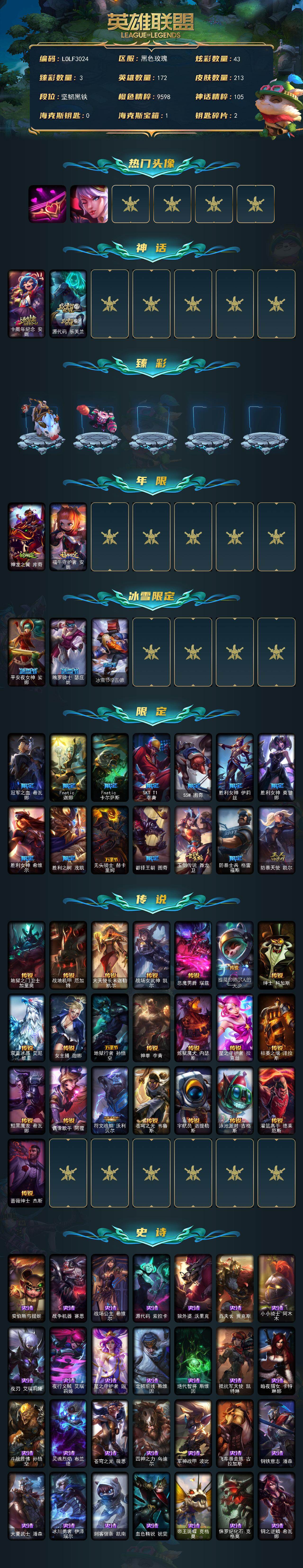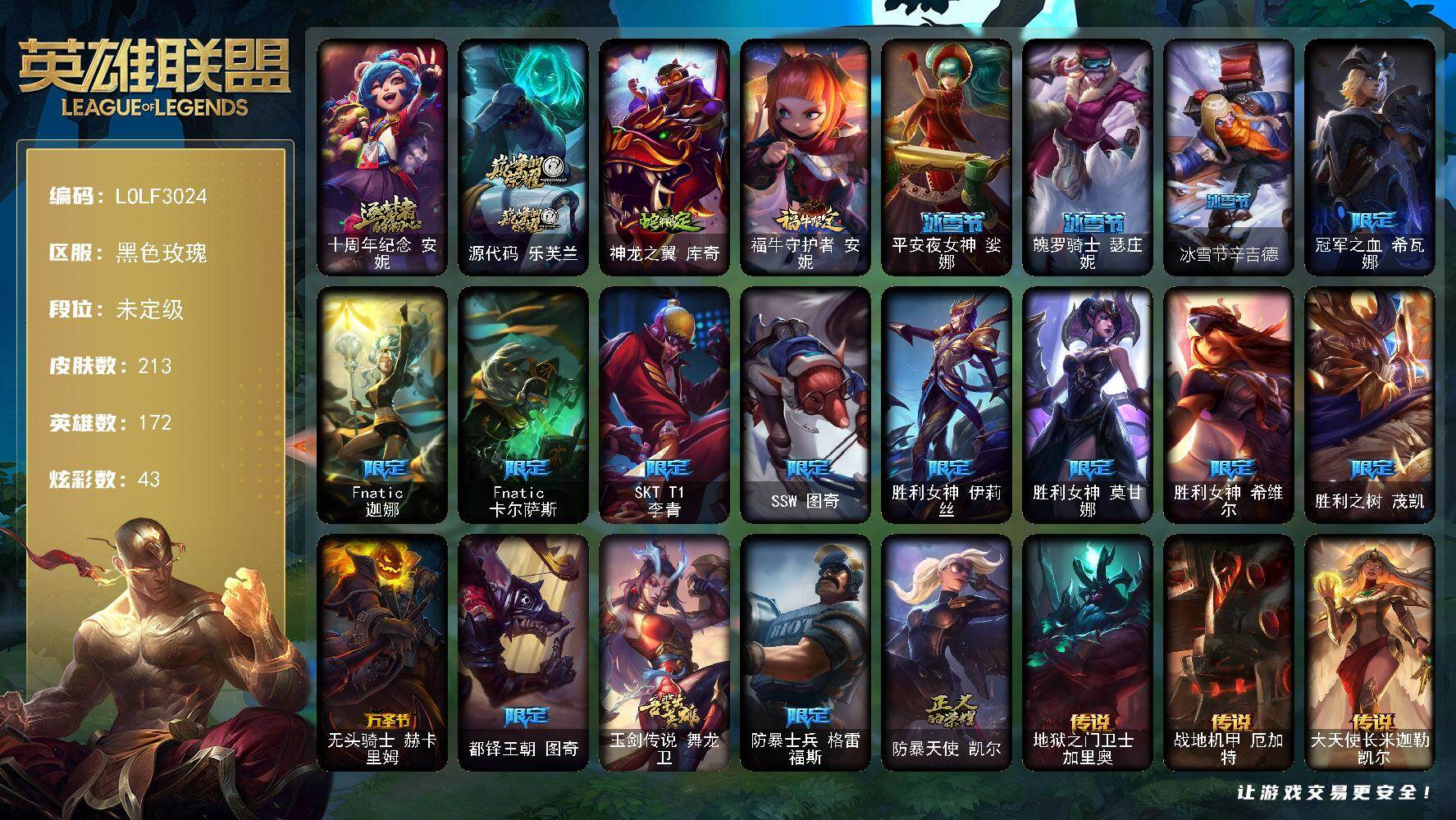 【701098】【LOLF3024】172英雄/213皮肤/2神话/19限定/3臻彩/43炫彩/22传说/51史诗/未定级/爱情之歌/觅心之翼奎因/十周年纪念安妮/源代码乐芙兰/无畏骑士瑟庄妮赤子初心/可爱可爱粉红红布里茨/魔女阿卡丽虚荣/神龙之翼库奇/福牛守护者安妮/平安夜女神娑娜/魄罗骑士瑟庄妮/冰雪节辛吉德/冠军之血希瓦娜/Fnatic迦娜/Fnatic卡尔萨斯/SKTT1李青/SSW图奇
