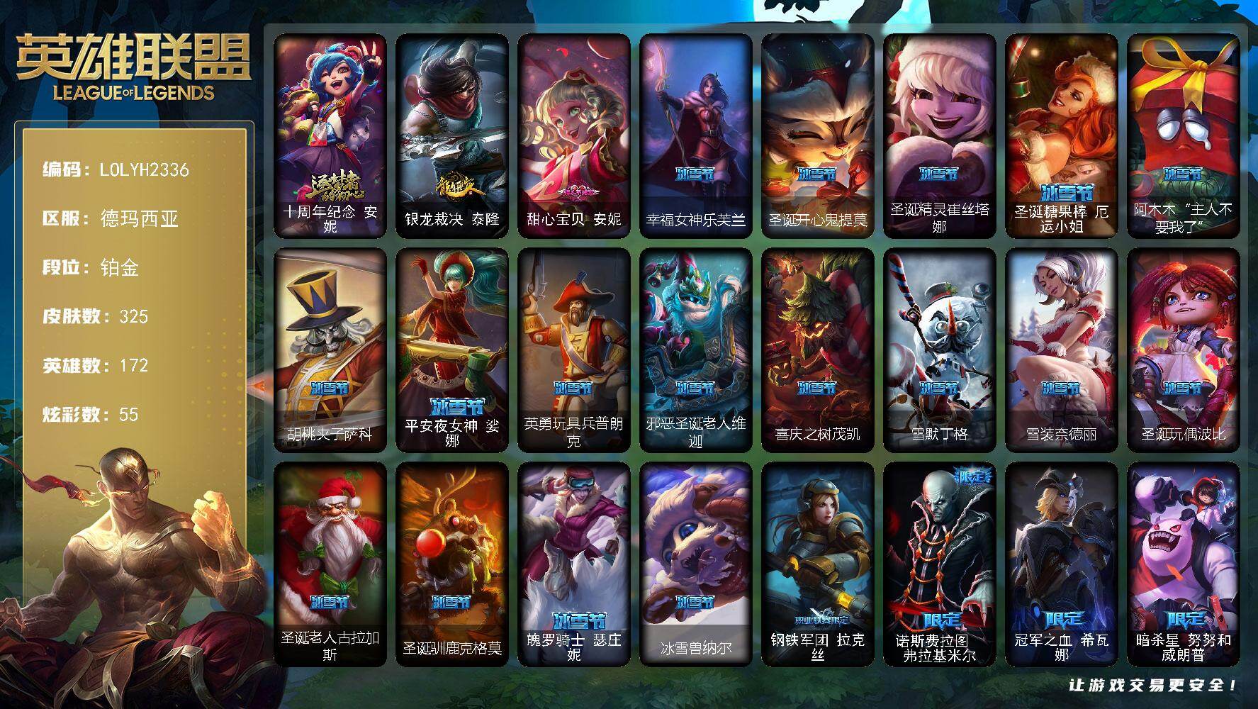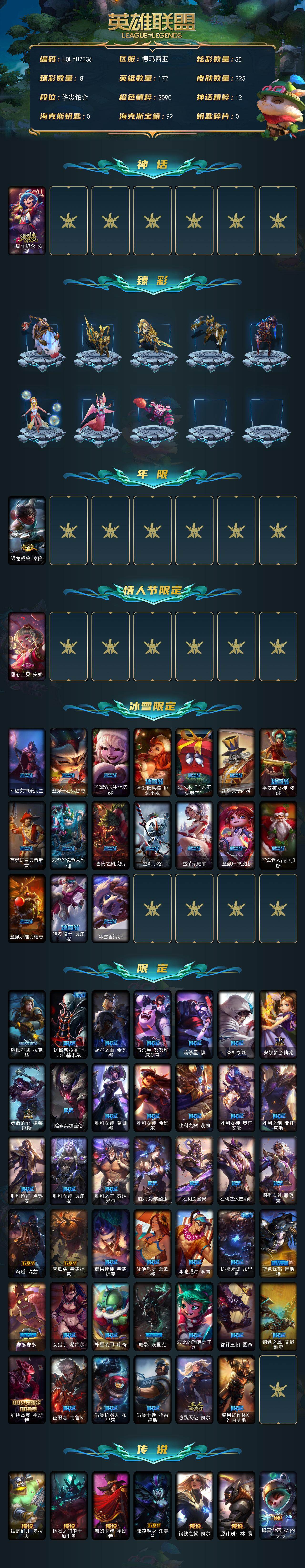 【701519】【LOLYH2336】172英雄/325皮肤/1神话/60限定/8臻彩/55炫彩/24传说/63史诗/铂金/十周年纪念安妮/无畏骑士瑟庄妮赤子初心/吕布奉先炫金战神/赵云子龙炫金将军/冠军之血希瓦娜凯旋圣装/玉剑传说无劫胭脂/泳池派对辛德拉荔枝枝连击/玉剑传说苍鸾丁香/可爱可爱粉红红布里茨/银龙裁决泰隆/甜心宝贝安妮/幸福女神乐芙兰/圣诞开心鬼提莫/圣诞精灵崔丝塔娜/圣诞糖果棒厄