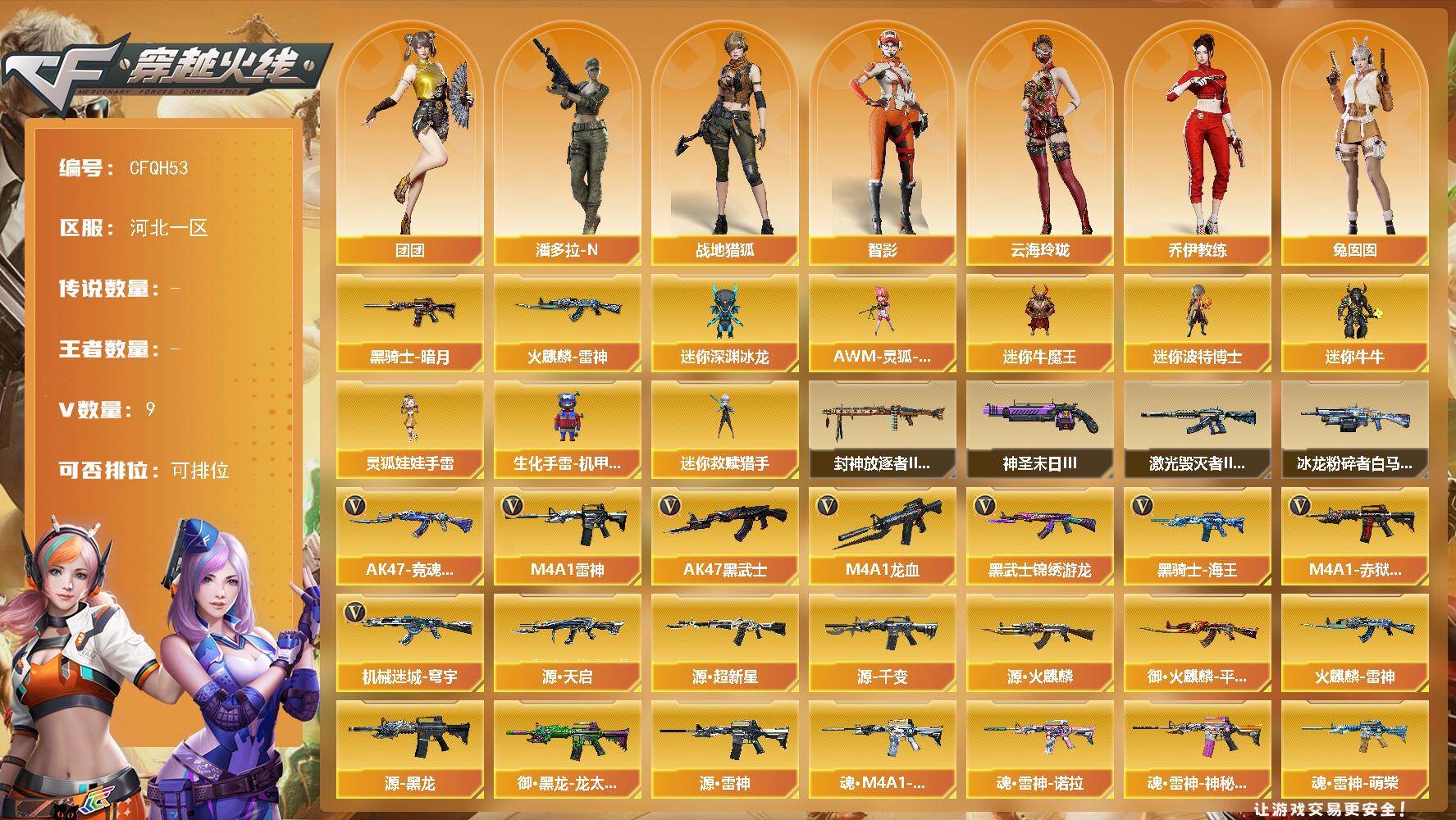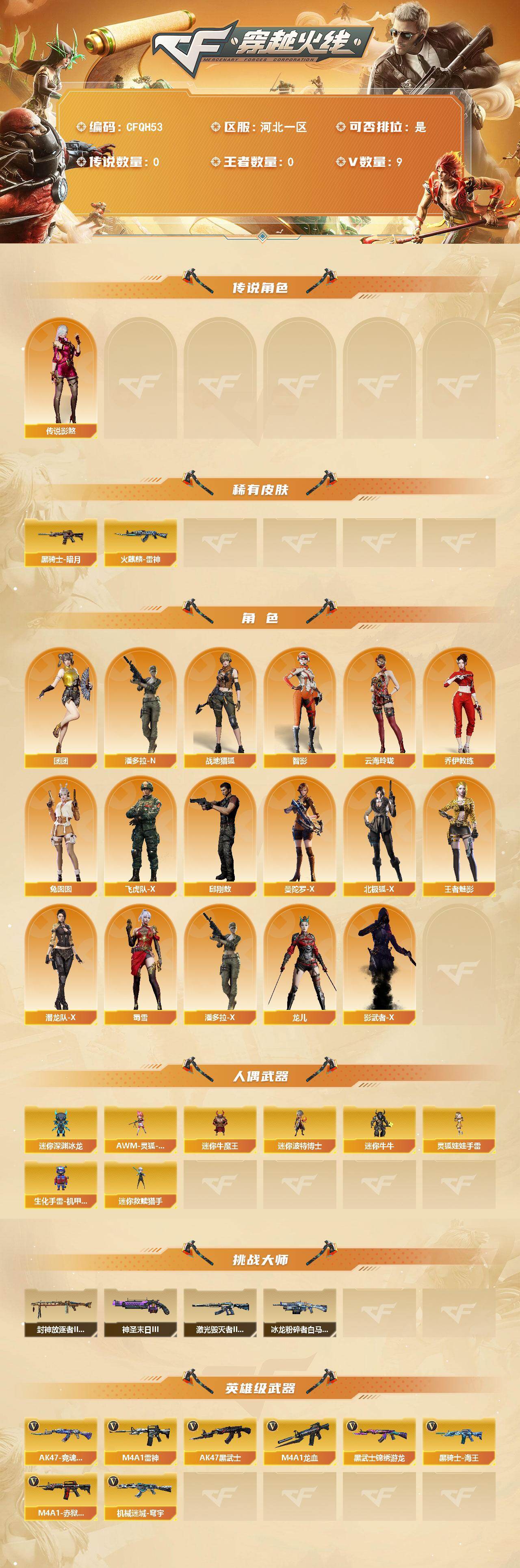 【701652】【701652】【CFQH53】7V/97级/将帅/2英雄/传说影煞/火麒麟-雷神/黑骑士-AG/战地猎狐/王者魅影/乔伊教练/云海玲珑/北极