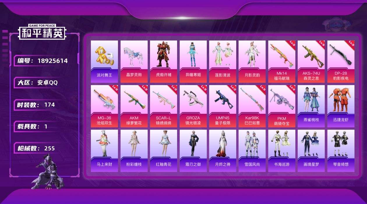 【701699】[18925614]【kyhp1928】安卓 手Q-4粉装-10特效枪-1载具-4粉色飞行器-75901热力值-18王牌印记-174套装-255枪皮【热门品类】:套装-派对舞王,套装-龟仙人,角色-8号机,角色-Mark.06【粉色套装】:粉装-莲影清波,角色-月影灵韵,角色-异瞳寒姬,角色-虎痴许褚【粉色枪皮等级】:AKM-绿萝繁花(五级),SCAR-L-锦绣绵绵(五级),GR
