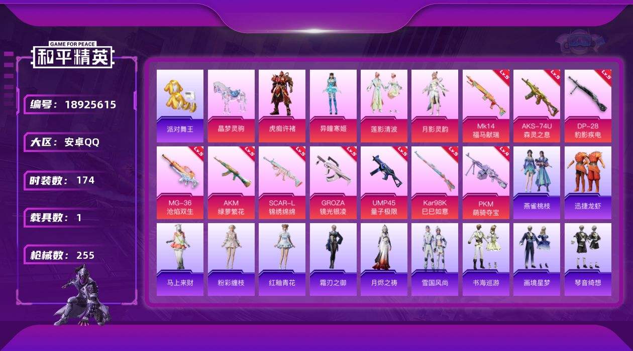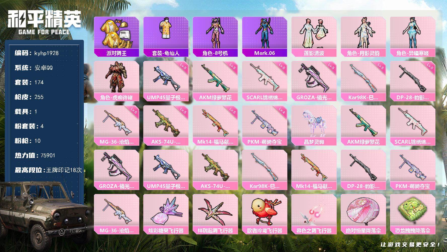【701700】[18925615]安卓 手Q-4粉装-10特效枪-1载具-4粉色飞行器-75901热力值-18王牌印记-174套装-255枪皮【热门品类】:套装-派对舞王,套装-龟仙人,角色-8号机,角色-Mark.06【粉色套装】:粉装-莲影清波,角色-月影灵韵,角色-异瞳寒姬,角色-虎痴许褚【粉色枪皮等级】:AKM-绿萝繁花(五级),SCAR-L-锦绣绵绵(五级),GROZA-镜光银凌(五