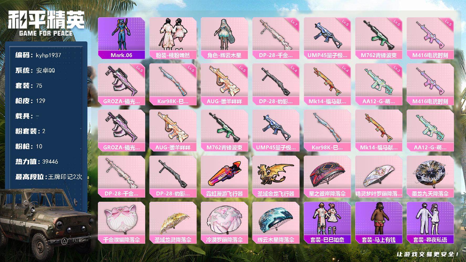 【701725】[18925848]安卓 手Q-2粉装-10特效枪-0载具-2粉色飞行器-39446热力值-2王牌印记-75套装-129枪皮【热门品类】:角色-Mark.06【粉色套装】:粉装-桃粉嫣然,角色-辉云木星【粉色枪皮等级】:M416-电玩时刻(五级),GROZA-镜光银凌(五级),AUG-暖羊咩咩(五级),M762-青锋波束(五级),UMP45-量子极限(五级),Kar98K-巳巳如