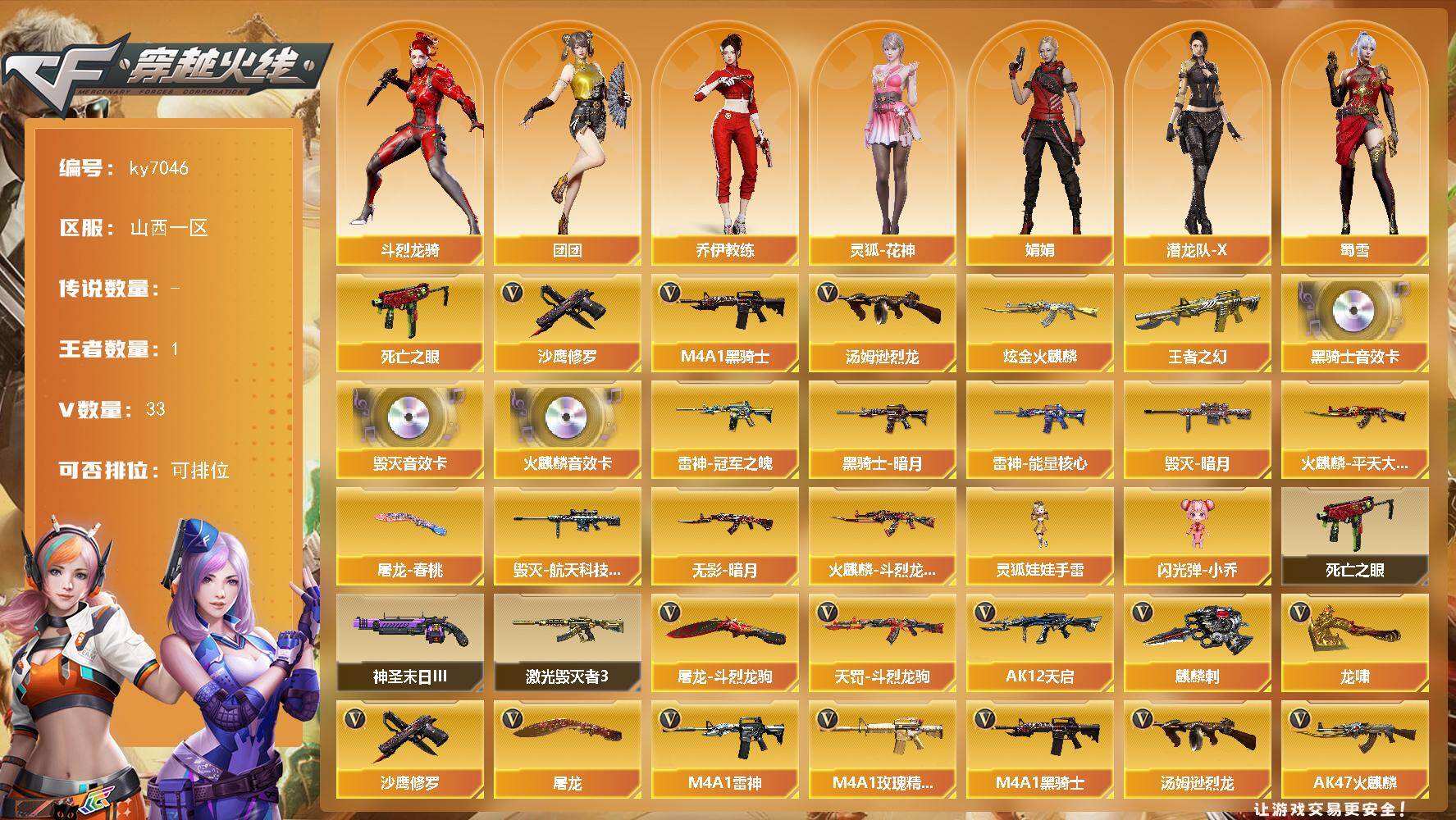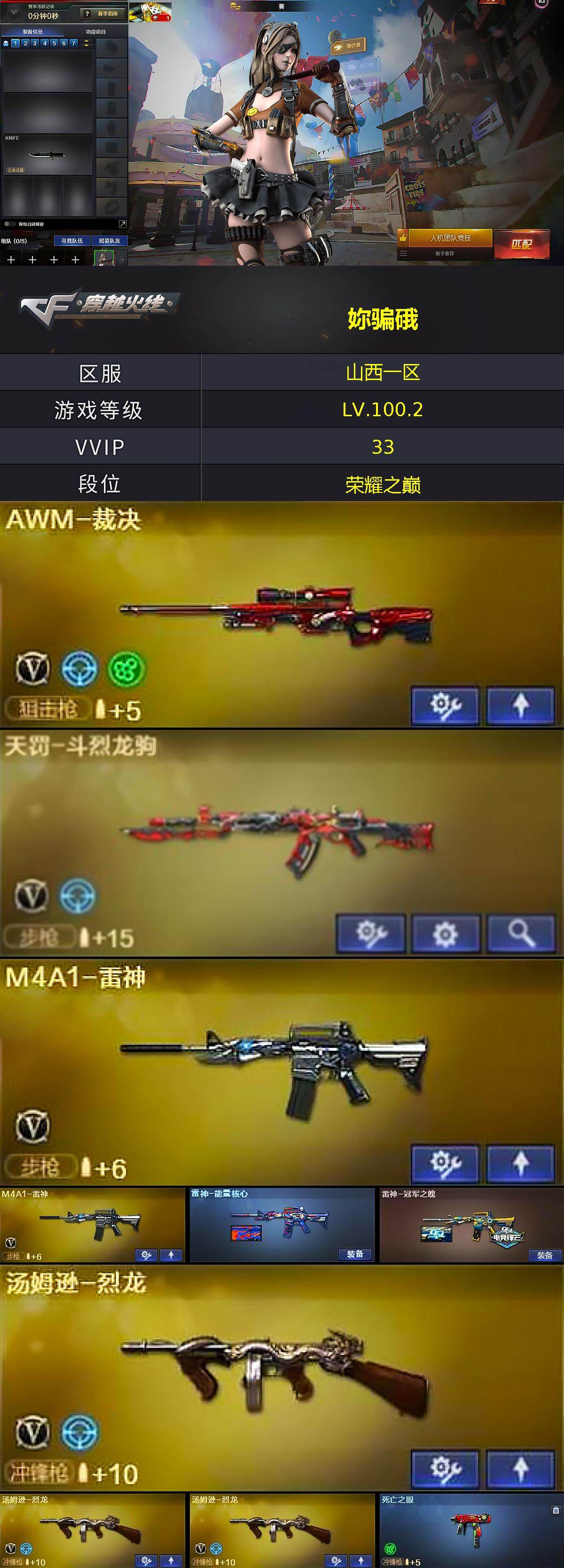 【701883】【701883】[18928194]山西一区-33V-1王者武器数-1炫金武器数【热门武器】:死亡之眼,M4A1-黑骑士,汤姆逊-烈龙*3,沙