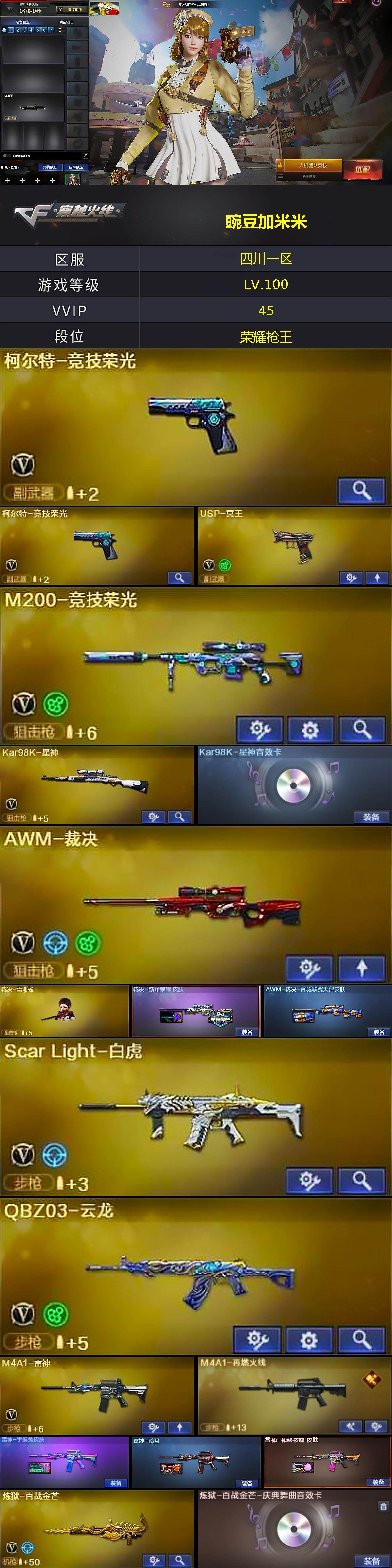 【701924】四川一区-44V-1王者武器数-0炫金武器数【热门武器】:Scar Light-白虎,修罗-古蛇迷踪,M200-竞技荣光,Kar98K-星神,裁决-雪莉杨,沙鹰-修罗【音效卡】:Kar98K-星神音效卡,屠龙-电竞之星-竞星跃动音效卡,HK417-朱雀-电竞之星-竞星跃动音效卡,Barrett-碧霄极光音效卡*3,炼狱-百战金芒-庆典舞曲音效卡,AWM-昌龙-怀旧音效卡【皮肤】: