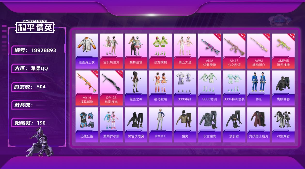 【701954】【可二次】【苹果QQ】龟仙人 恐龙拽拽 漫步者 迅捷狂鲨 暗夜契约 AWM-橘柚倾心 UMP45-恐龙拽拽 豚鼠丹丹 AKM-炫紫旋律 M416-心之恋语 粉红小猪 宝贝奶油派 瑞龙福将 蝶舞迷情 浪漫天命 雪山精英 激萌罗小黑 团圆交子