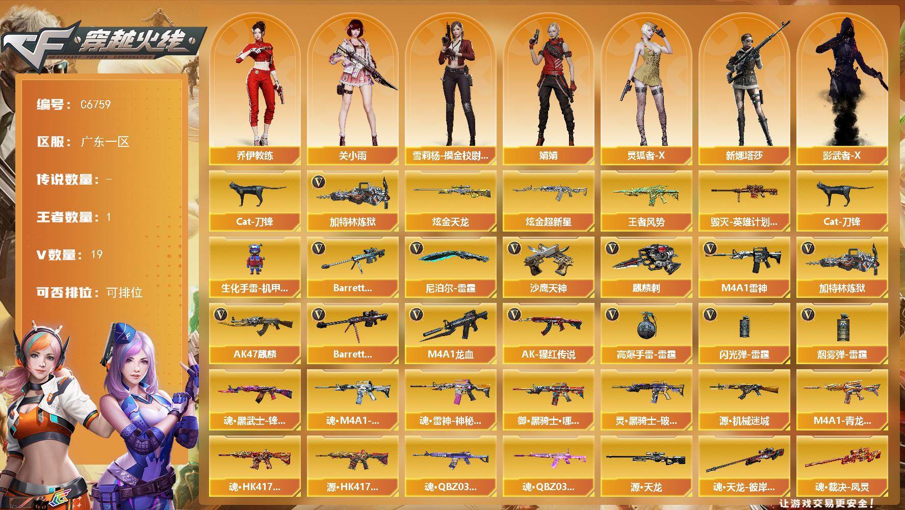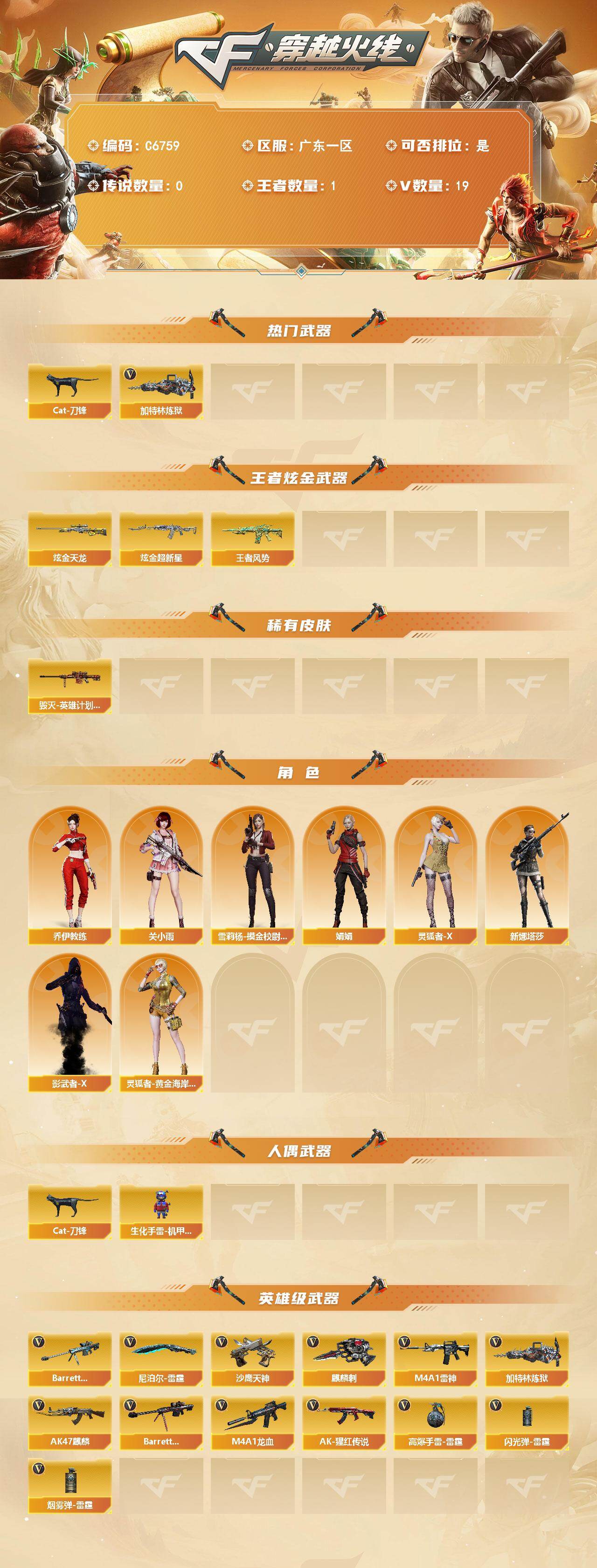 【703734】【703734】【C6759】广东一区-19V-1王者武器数-2炫金武器数【热门武器】:Cat-刀锋,加特林-炼狱【王者炫金武器】:王者风势,