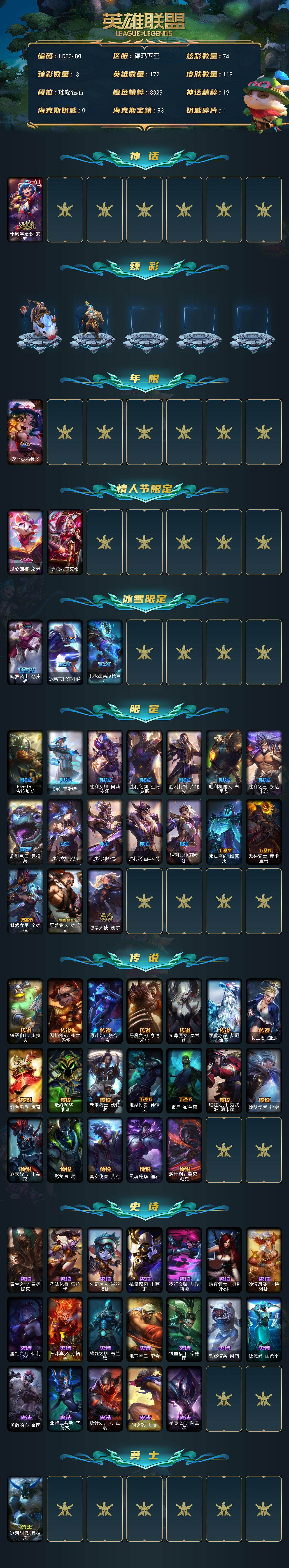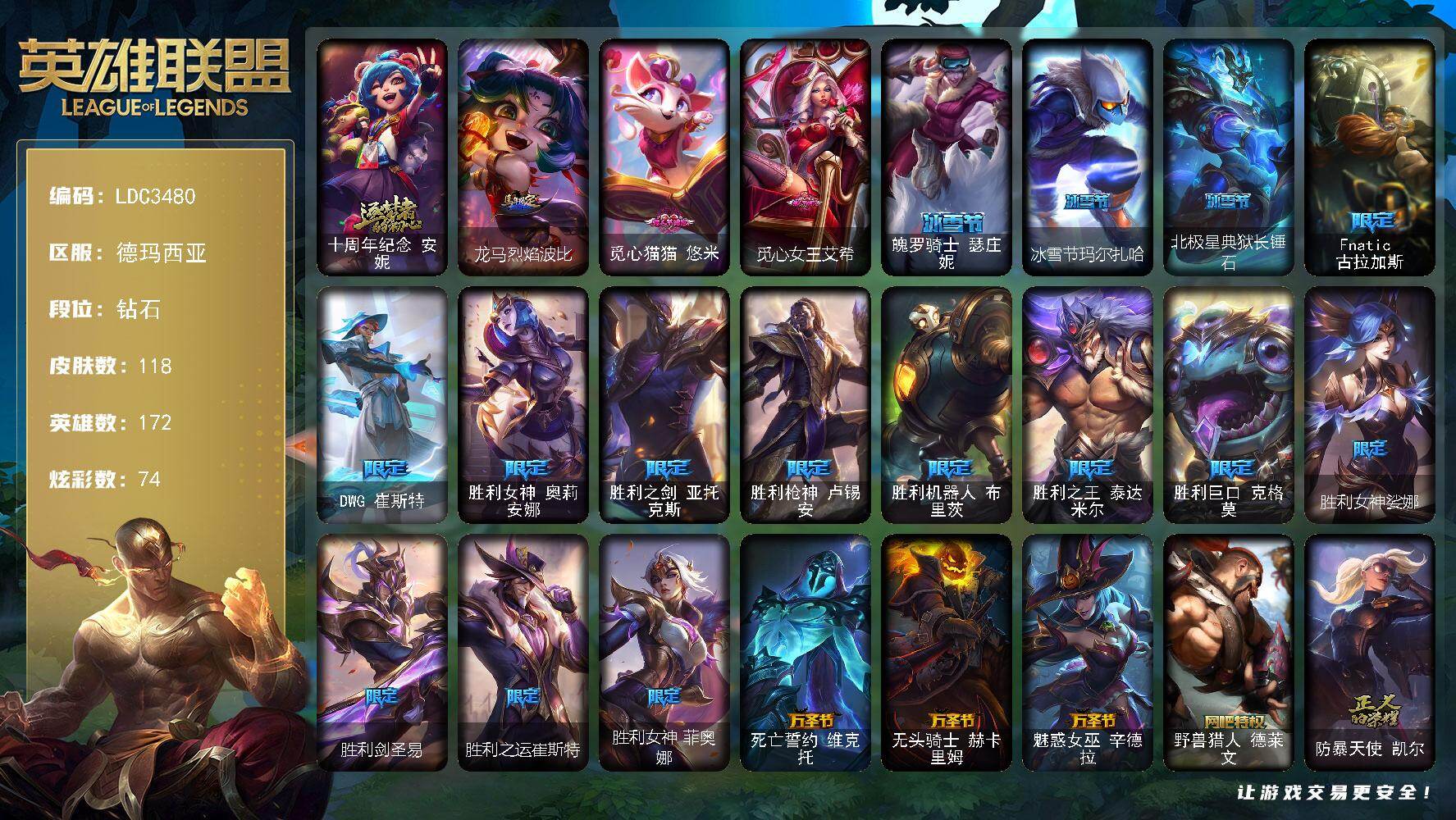 【703850】【LDC3480】172英雄/118皮肤/1神话/24限定/3臻彩/74炫彩/19传说/19史诗/钻石/十周年纪念安妮/无畏骑士瑟庄妮赤子初心/冠军之志瑞兹凯旋圣装/春晖神女艾希玉露金风/龙马烈焰波比/觅心猫猫悠米/觅心女皇艾希/魄罗骑士瑟庄妮/冰雪节玛尔扎哈/北极星典狱长锤石/Fnatic古拉加斯/DWG崔斯特/胜利女神奥莉安娜/胜利之剑亚托克斯/胜利枪神卢锡安/胜利机器人布里