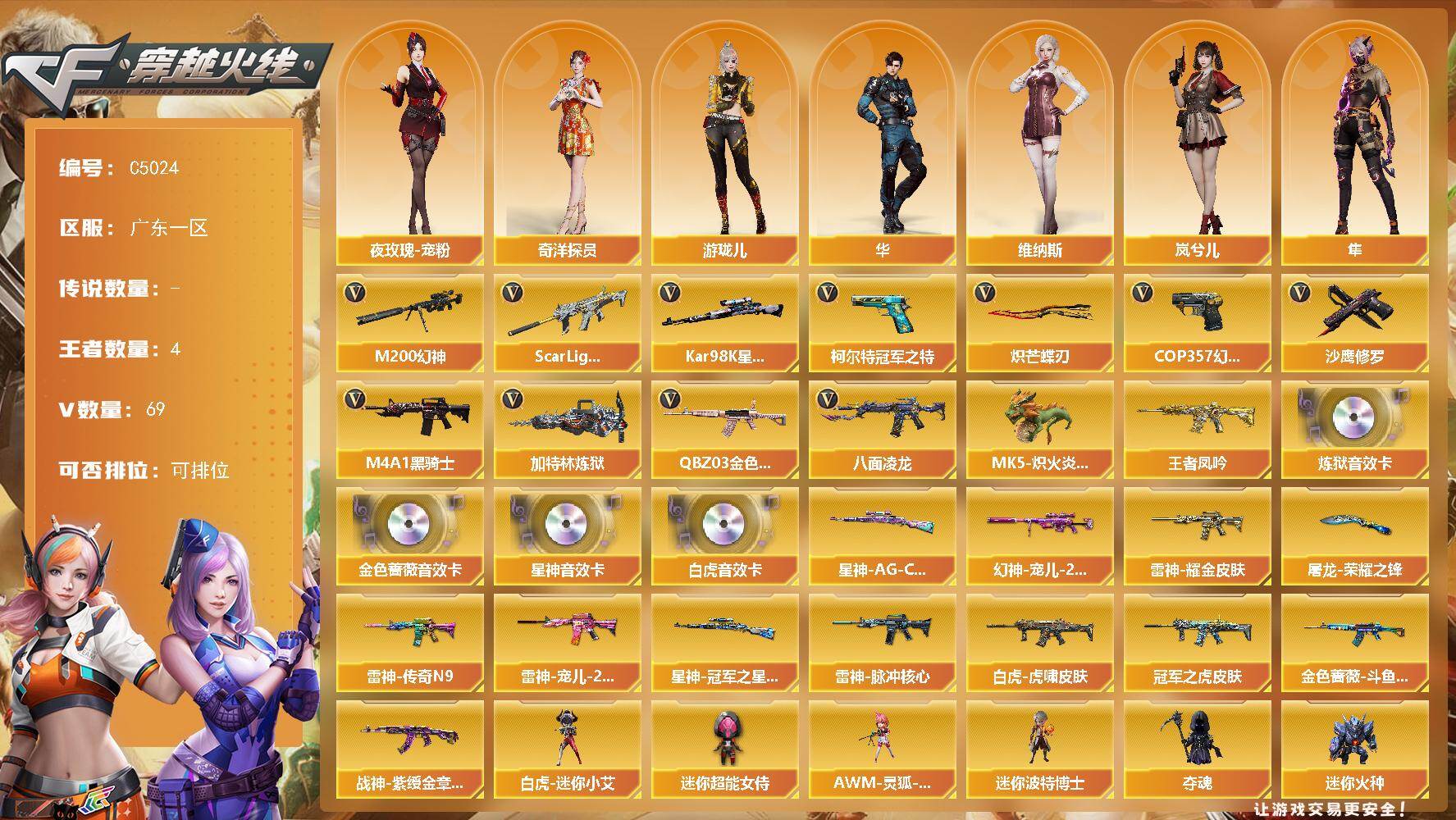 【704307】【704307】【C5024】广东一区-68V-4王者武器数-0炫金武器数【传说角色】:传说影煞【热门武器】:QBZ03-金色蔷薇,Scar
